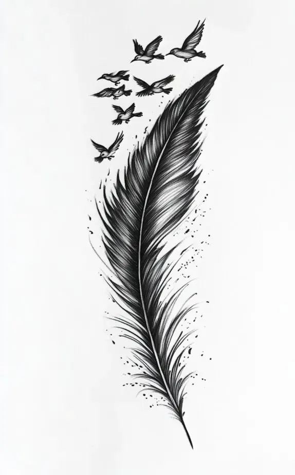 This tattoo design captures a poetic transition from a feather into a flock of birds taking flight. The feather, detailed with delicate lines, symbolizes freedom and inspiration. As it morphs into birds, the design embodies the idea of liberation and the pursuit of dreams.