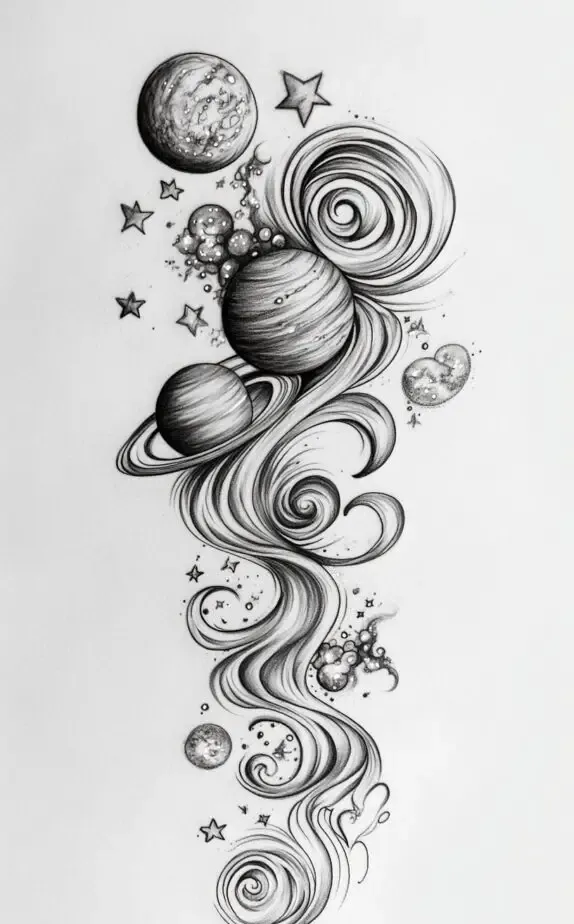 A cosmic-themed tattoo showcasing a swirling array of planets, stars, and celestial elements. This design brings the universe to life on the skin, with intricate details that capture the grandeur of space. The spiral formation adds a dynamic touch, suggesting the eternal dance of the cosmos.