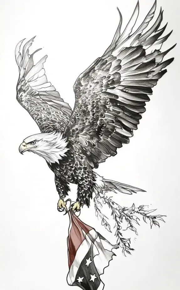 A majestic tattoo of an eagle carrying a flag, symbolizing freedom, patriotism, and pride. The eagle s wings are spread wide, showcasing each feather s detail, and its intense gaze conveys strength and vigilance. The flag, held firmly in its talons, adds a meaningful touch of loyalty and dedication.