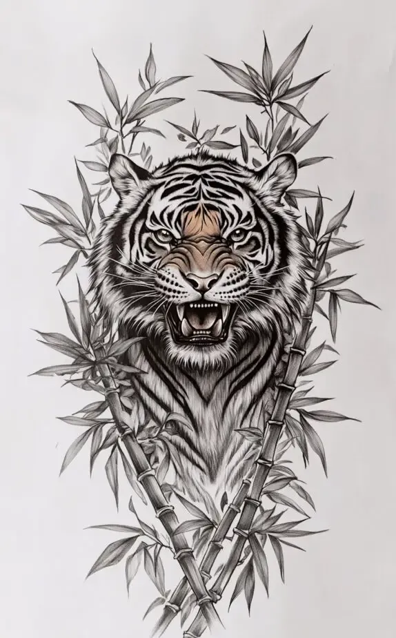 This striking tattoo of a tiger surrounded by bamboo embodies strength, courage, and resilience. The tiger s fierce expression is captured in impressive detail, with its eyes and teeth exuding power. The bamboo adds an element of balance and calm, symbolizing flexibility and growth.