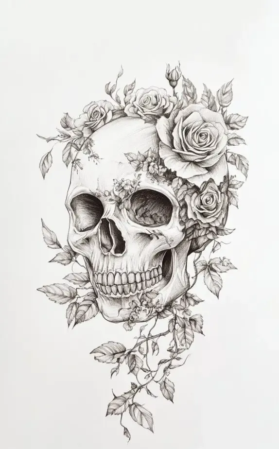 The detailed petals and subtle vines soften the starkness of the skull, adding a touch of elegance and hope. This tattoo appeals to those who embrace both the light and dark aspects of existence, making a powerful statement about life s cycles.