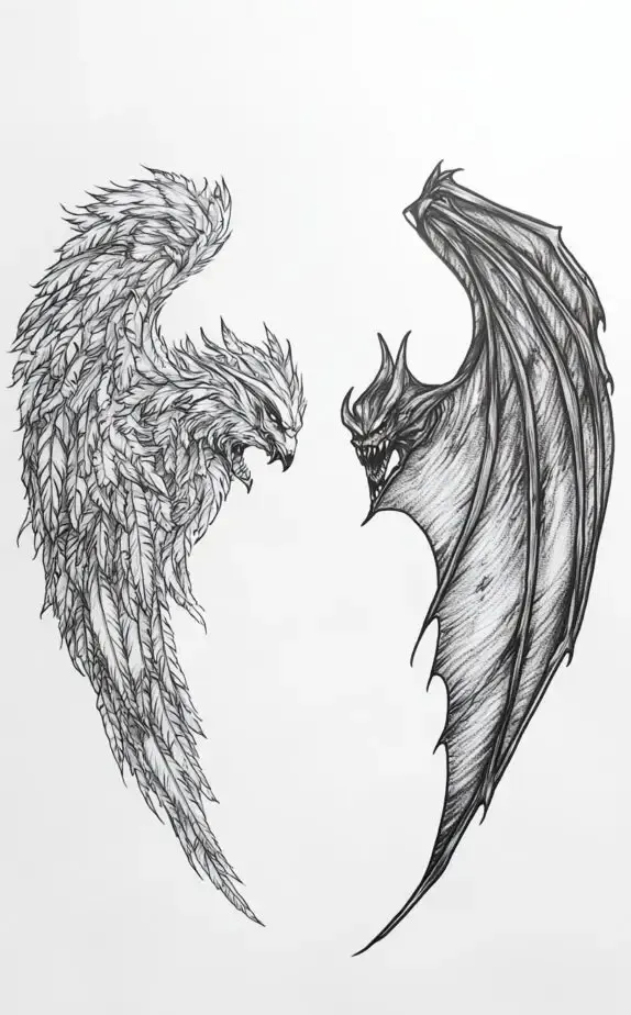 This unique tattoo juxtaposes the wings of a bird and a bat, embodying the contrast between light and dark. The bird wing is intricately detailed, exuding grace and freedom, while the bat wing, with its dark and intense form, symbolizes mystery and strength.