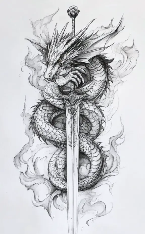 This intricate tattoo design features a powerful dragon wrapped around a sword, exuding strength and mysticism. The dragon s detailed scales and fierce eyes draw attention, making it a perfect piece for those seeking a bold statement. The sword, sharp and ornate, symbolizes honor and protection, adding depth to the piece s meaning.