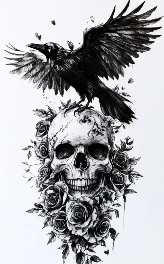 This powerful tattoo features a raven perched atop a skull, surrounded by roses. The raven, symbolizing mystery and intelligence, contrasts sharply with the skull, which represents mortality and the fleeting nature of life. The roses bring an element of beauty, signifying life and hope amidst darkness.