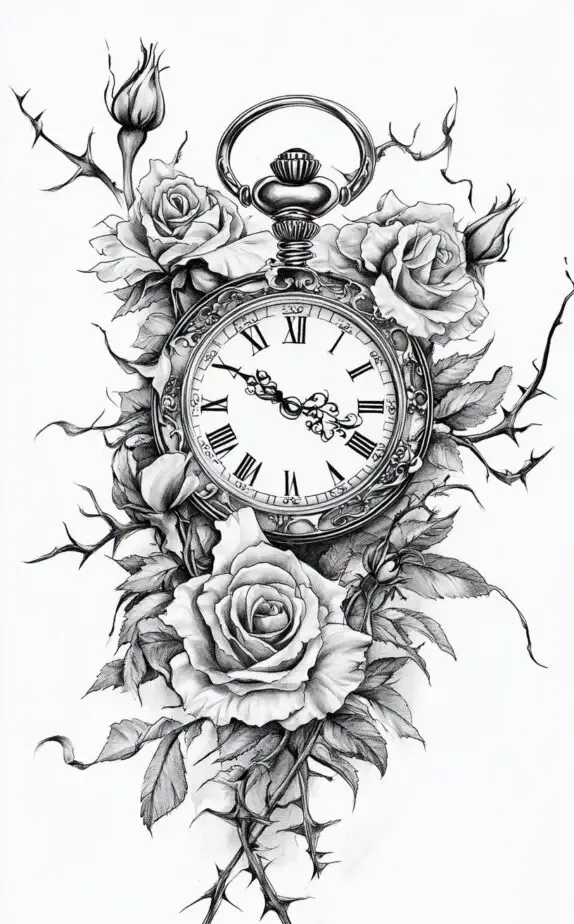 The pocket watch tattoo intertwined with blooming roses represents the passage of time and the beauty of life. The watch, with its Roman numerals and intricate detailing, hints at timeless memories and moments that are cherished.