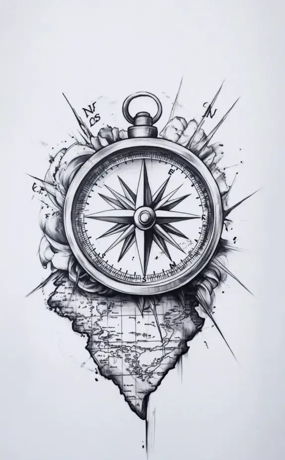 The map background, sketched in subtle shades, hints at an uncharted journey or a cherished place. The merging of the compass and map in this design evokes the call of the unknown, making it perfect for wanderers and free spirits who are guided by their inner compass.