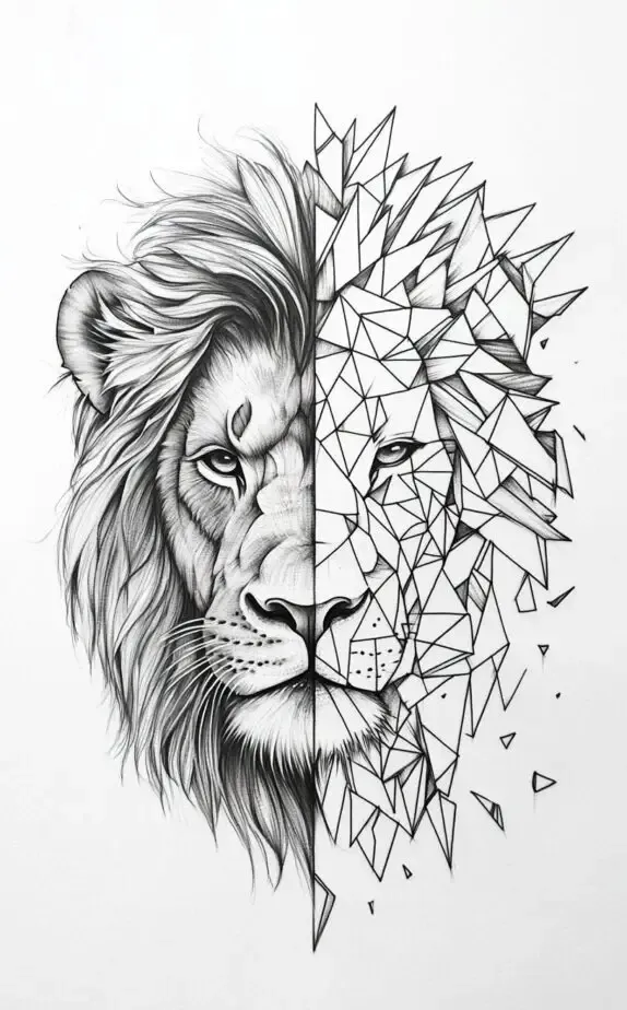Half naturalistic and half geometric, this lion tattoo is a striking visual representation of strength, courage, and duality. One side of the lion s face features realistic fur and an intense gaze, while the other side is composed of precise geometric shapes that break apart, symbolizing both structure and freedom.