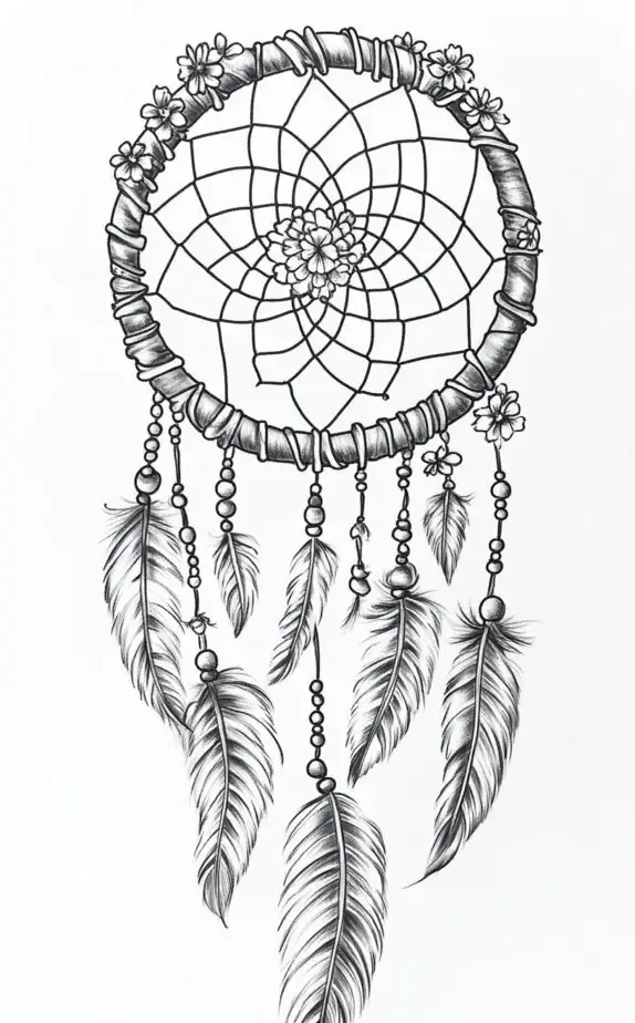 A dreamcatcher tattoo interwoven with delicate floral accents, blending traditional Native American symbolism with nature s beauty. The web at the center captures negative energy, while the feathers and flowers symbolize protection, hope, and positive energy.