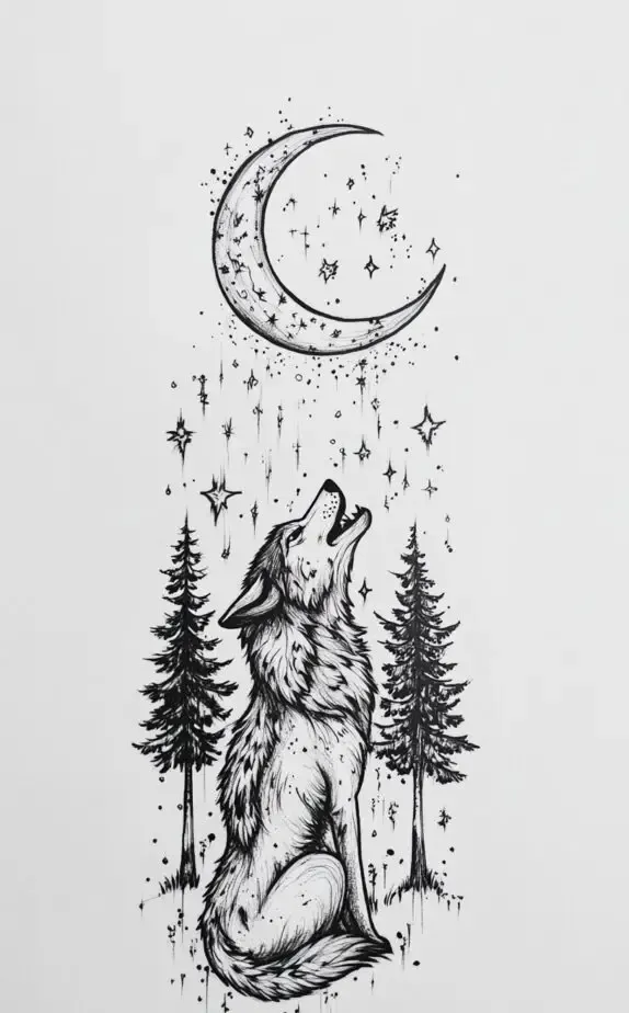 A classic design brought to life with exquisite line work, this tattoo showcases a wolf sitting beneath a crescent moon, surrounded by twinkling stars and tall pine trees. The wolf, a symbol of loyalty, intuition, and strength, appears in a state of calling out, resonating with the wild and untamed.