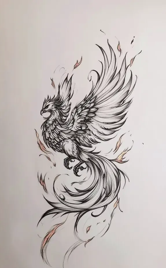 The delicate touches of red and orange hues breathe life into the tattoo, emphasizing its fiery essence. For those who resonate with themes of overcoming hardship and personal growth, this piece serves as an inspiring reminder of their journey and the strength to rise anew.