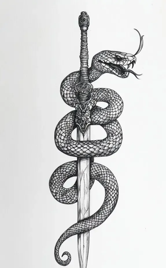 This design is perfect for individuals who resonate with themes of transformation, vigilance, and the dual nature of strength and wisdom. The combination of the fierce snake and the blade makes for a striking tattoo that exudes authority.