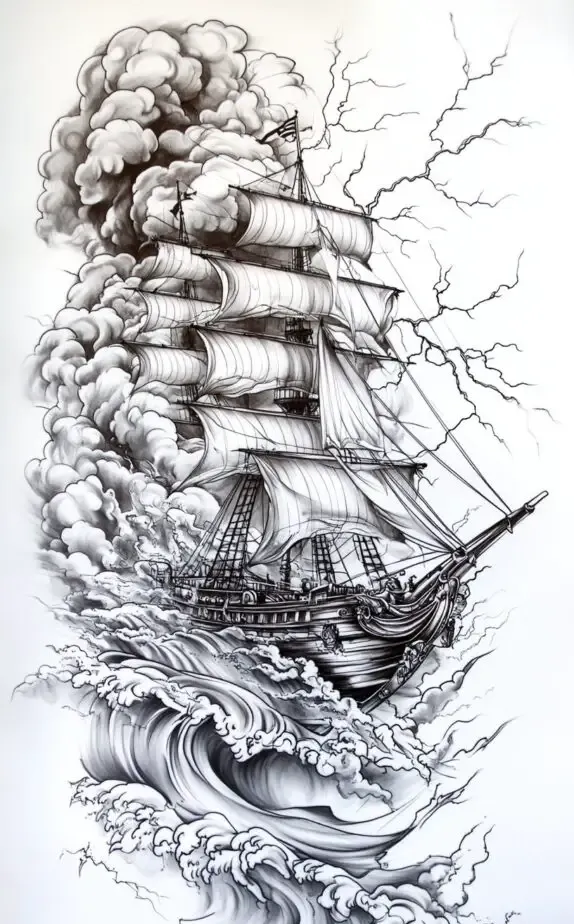 This dynamic tattoo portrays a majestic ship battling against roaring waves, surrounded by turbulent clouds and a flash of lightning. The detailed rigging, sails, and woodwork of the ship evoke classic maritime art, symbolizing resilience and the spirit of adventure.
