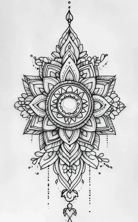 A stunning mandala tattoo that showcases elaborate geometric patterns and intricate detailing. The symmetrical design radiates balance and unity, representing wholeness and the universe. Each petal and layer contributes to the mandala s mesmerizing aesthetic, drawing viewers into its center.