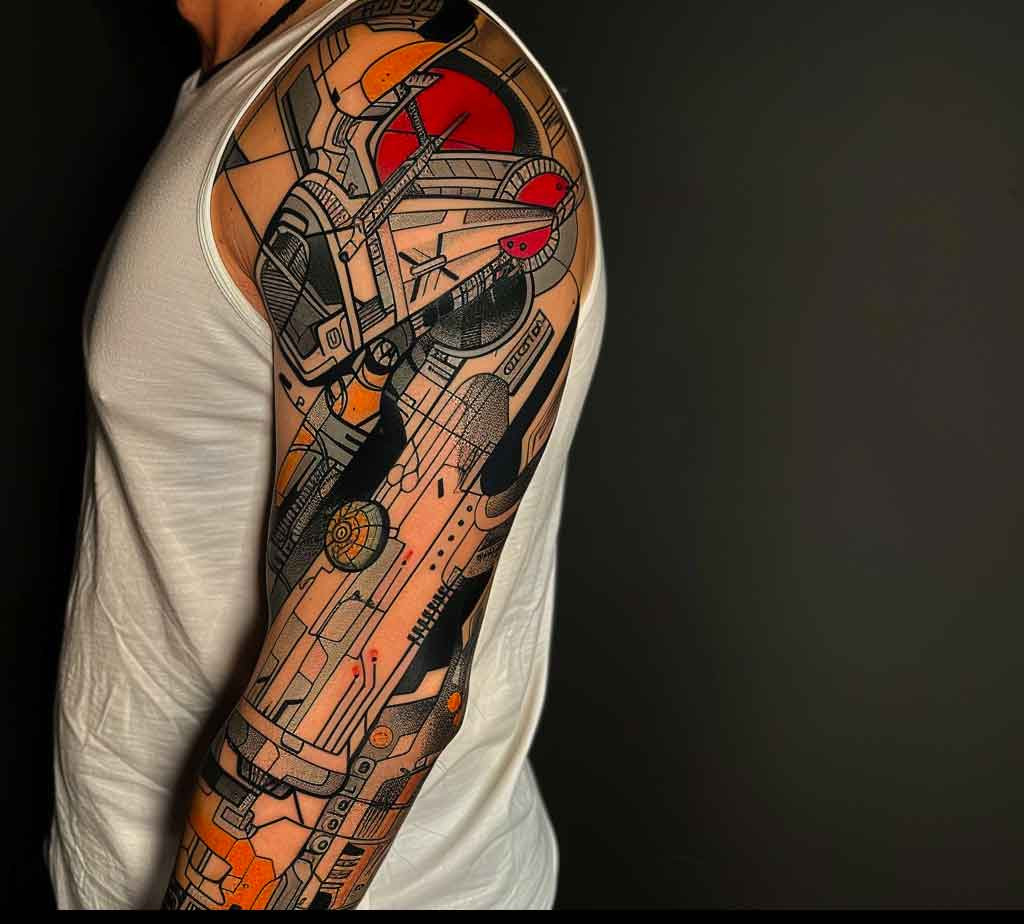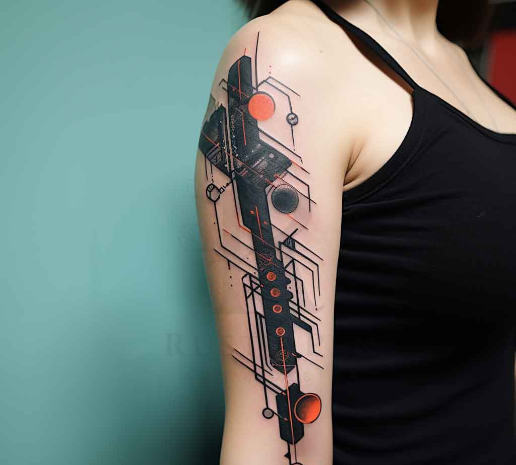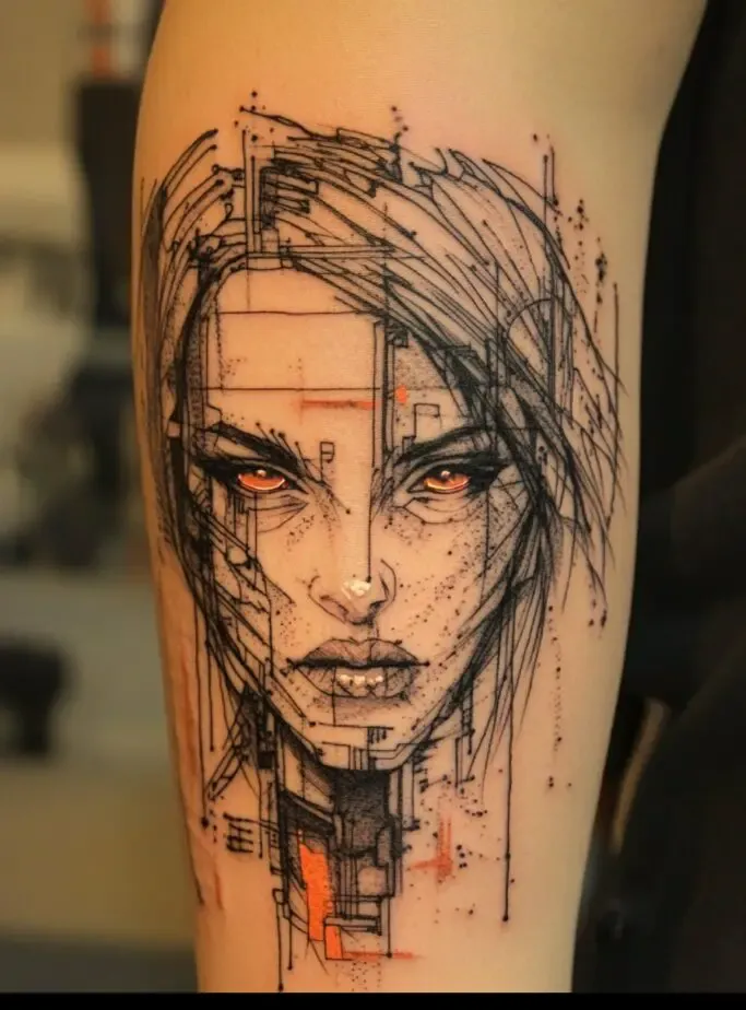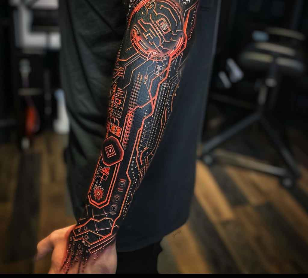 This dark piece has orange highlights and is one of our favorite cyberpunk tattoo styles.