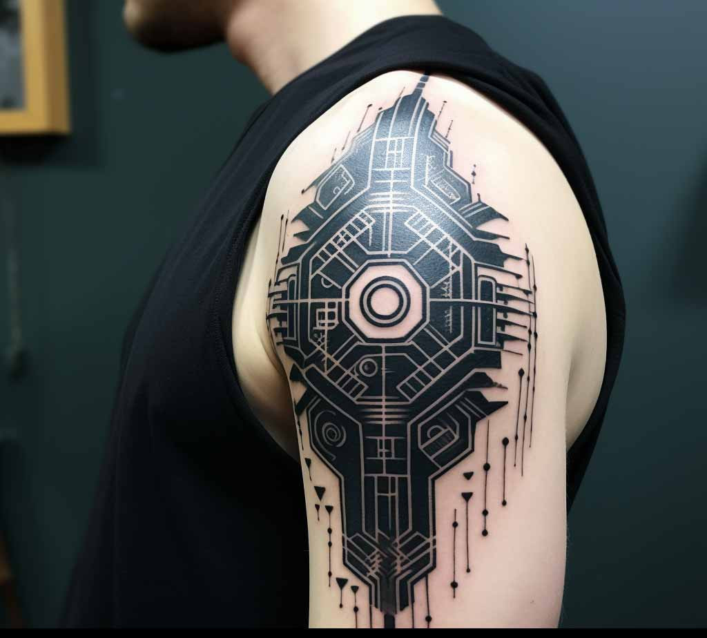 This tattoo is a black design that looks like a piece of machinery or circuitry. It s on the person s upper arm and shoulder, and it has many straight lines and geometric shapes.