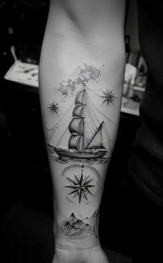 Image 5 elevates the sailing ship concept by adding celestial and geographic details. This tattoo includes constellations and a mountainous background, symbolizing the guidance of the stars and land. This is perfect for individuals who find inspiration in both the sea and the skies, reflecting their multifaceted love for exploration.