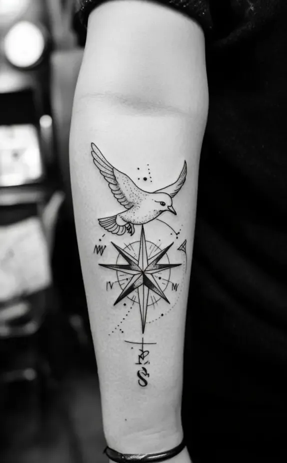 Finally, Image 10 features a modern take on the compass tattoo. A detailed bird with open wings hovers over the compass, symbolizing freedom, clarity, and direction. The monochrome design uses clean lines and shading to bring the piece to life. It s a fantastic option for men looking for a contemporary yet meaningful tattoo.