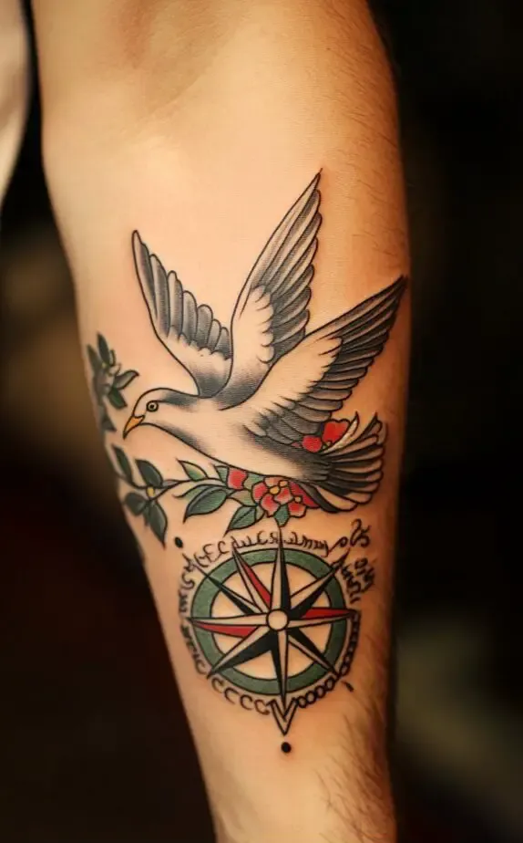Returning to the theme of the dove, Image 9 showcases a colorful traditional compass tattoo paired with flowers and a dove in flight. The use of color gives the tattoo a classic, old-school aesthetic, and the dove s association with peace and direction enhances the compass s symbolism. This design is perfect for someone who loves traditional tattoo styles with rich colors and symbolic layers.