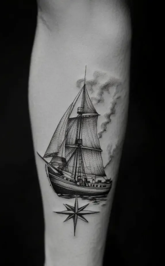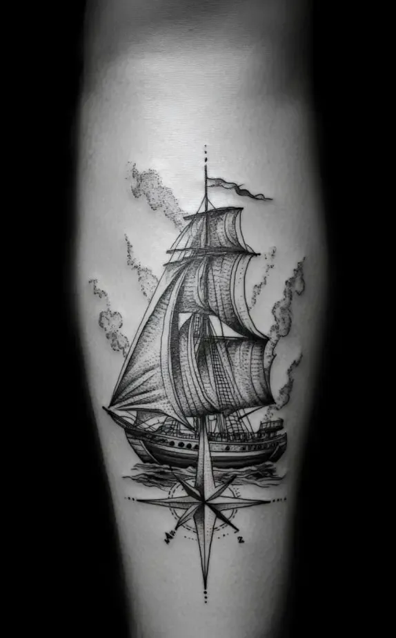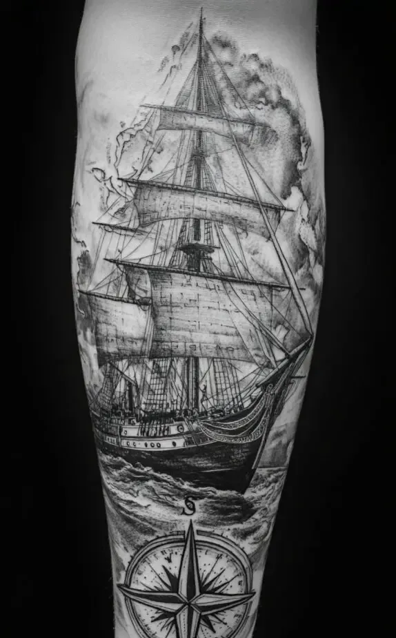 For maritime enthusiasts, the tattoo in Image 4 features a sailing ship seamlessly integrated with a compass. This monochromatic design reflects the spirit of adventure and exploration, with the ship representing a journey and the compass providing direction. This is an excellent tattoo for men who identify with the rugged and adventurous lifestyle of sailors and explorers.