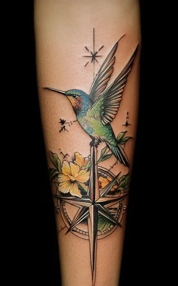 For those who love vibrant colors, Image 2 offers an eye-catching design featuring a colorful hummingbird perched on a compass. The tattoo blends nature and navigation, symbolizing exploration and energy. The addition of floral elements adds a touch of softness to the piece, making it perfect for men who want a bright yet meaningful tattoo that reflects vibrancy in their life journey.