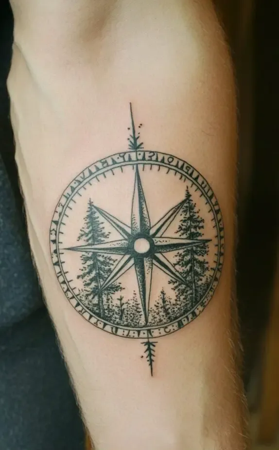 The tattoo in Image 8 features a circular compass design with an intricate forest scene inside. This tattoo highlights the unity of navigation and nature, symbolizing the journey through life s wilderness. Its clean, circular frame provides symmetry, making it both visually appealing and meaningful for those connected to the outdoors.