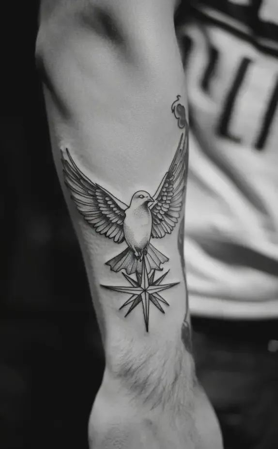The first design in our lineup is a sleek and minimal compass tattoo adorned with a dove flying above. The tattoo (Image 1) emphasizes freedom and guidance the dove symbolizing peace and the compass representing direction. This black-and-white design is ideal for those who prefer understated ink with significant meaning. The clean lines and small dot work make it timeless and versatile.