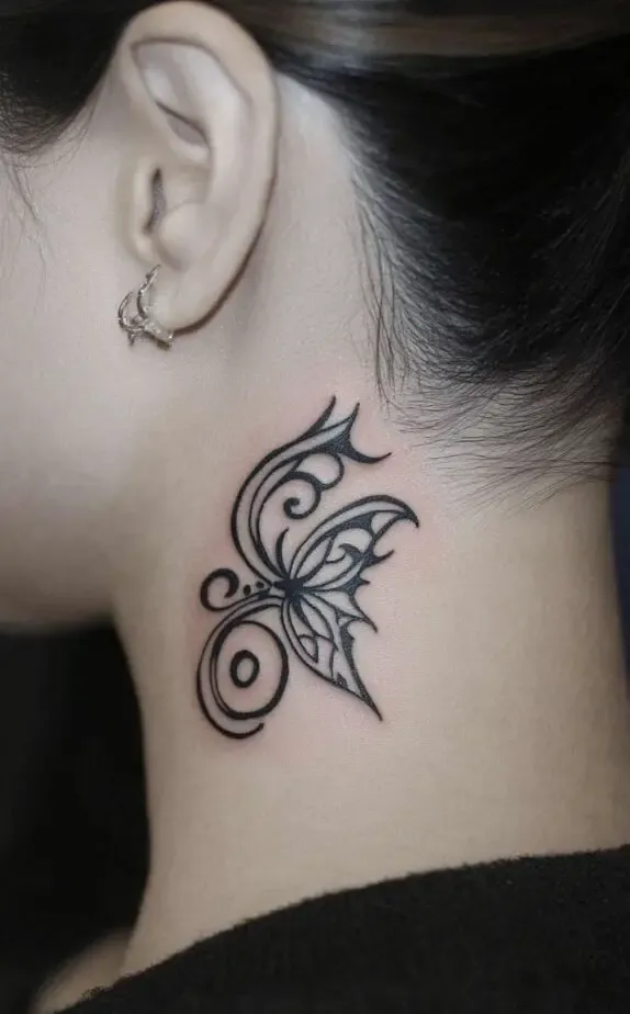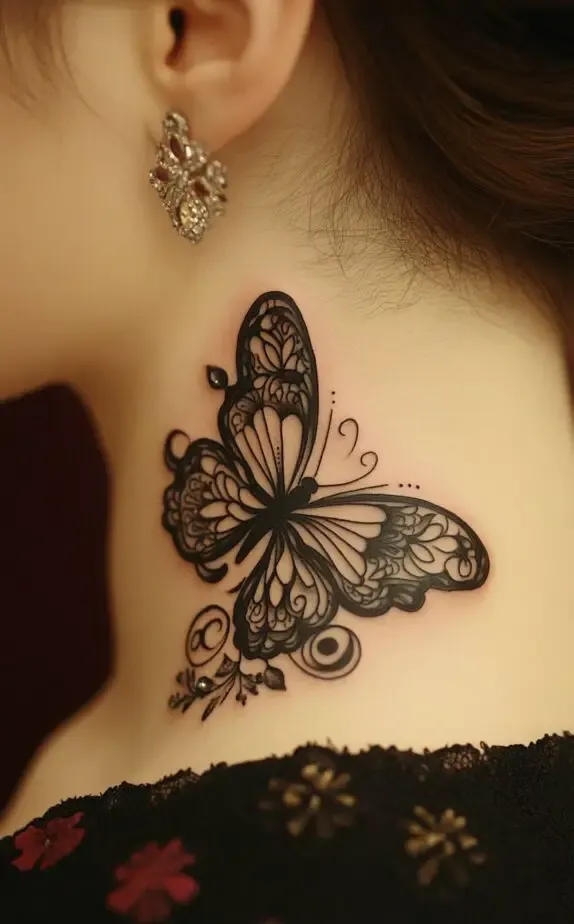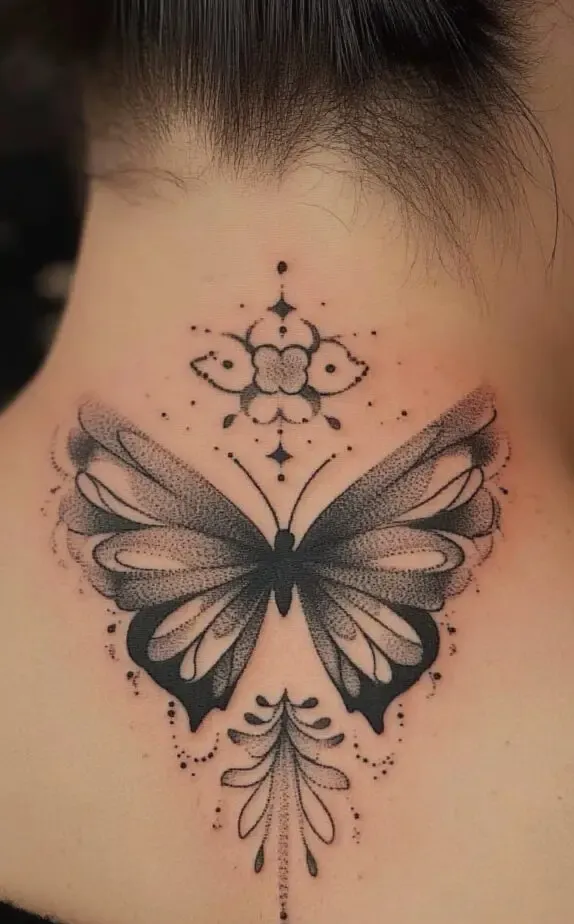 For a touch of delicacy and grace, a butterfly tattoo is an excellent option. The sixth design showcases a beautifully detailed butterfly placed at the base of the neck. Butterflies often represent transformation, freedom, and new beginnings. The soft shading and precise dot work in this piece highlight its elegance and timeless appeal.