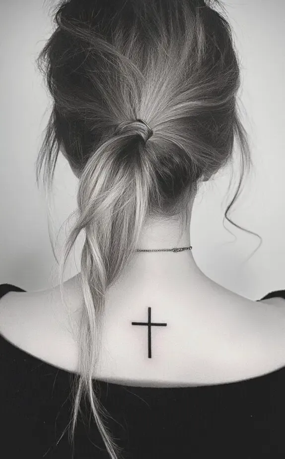 A simple yet striking cross tattoo on the back of the neck carries deep spiritual significance. This timeless design serves as a powerful statement of faith and devotion. Its minimalist aesthetic makes it a versatile piece that resonates with the wearer s inner strength and beliefs.