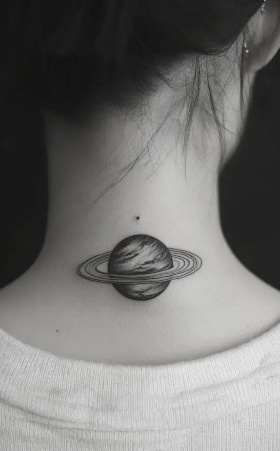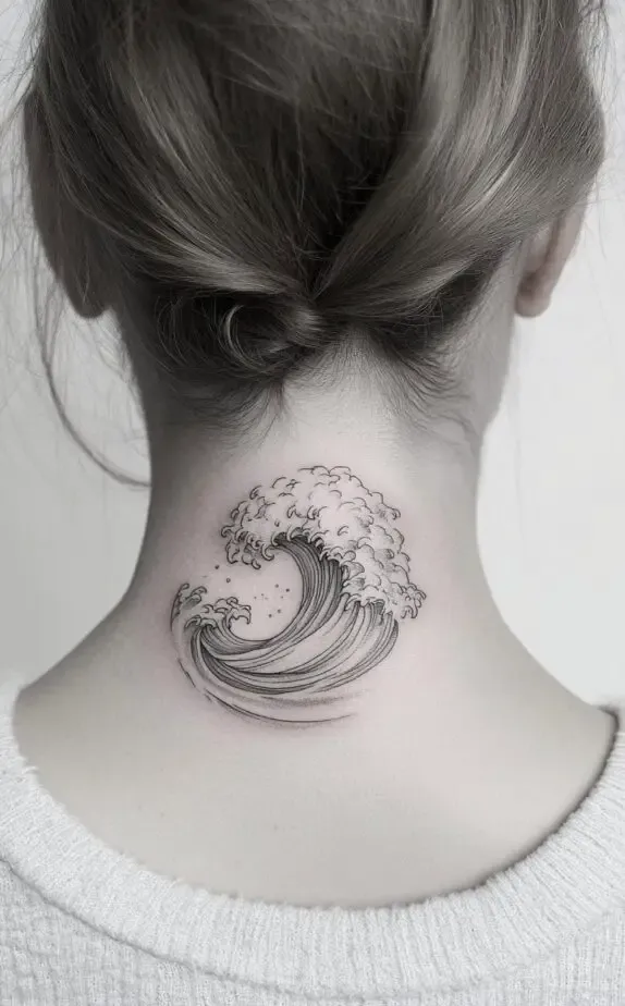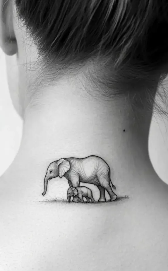 Animal lovers will adore this minimalist depiction of an elephant and her calf, delicately etched on the back of the neck. Elephants are revered as symbols of wisdom, family, and strength. This heartwarming tattoo speaks to the bond between loved ones and the enduring strength of maternal relationships. Its simplistic design makes it both meaningful and visually appealing.