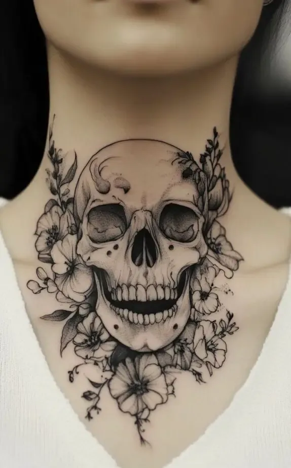 The third design juxtaposes the macabre with the beautiful, featuring a detailed skull surrounded by blooming flowers. This tattoo symbolizes the coexistence of life and death, a reminder of the transient nature of existence. The artistic shading and floral details make it a standout piece for women who appreciate intricate artwork with profound meaning.