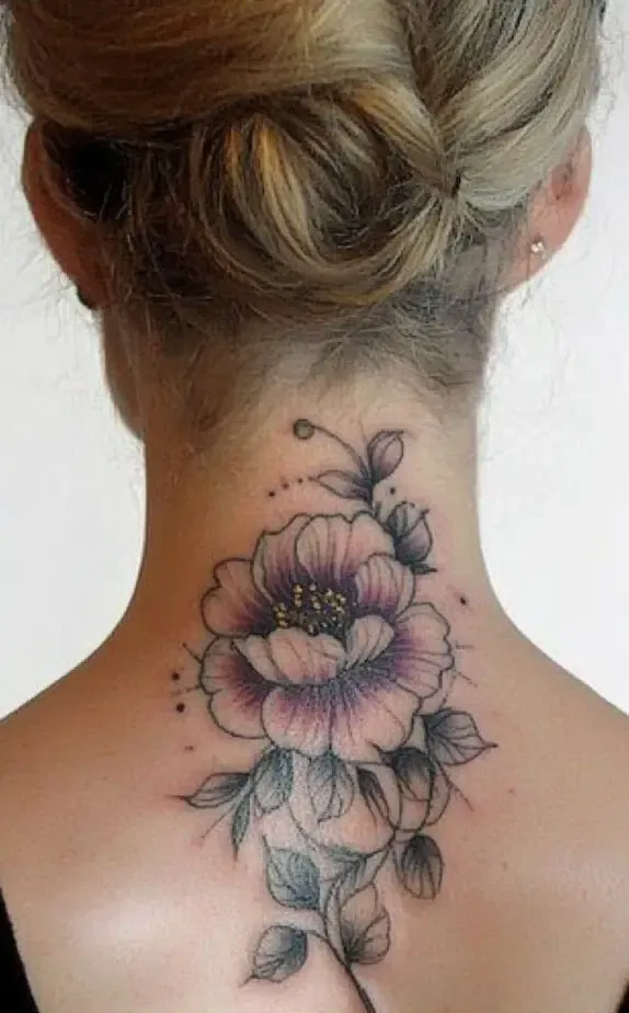 Floral tattoos are among the most popular designs for women, and this piece is no exception. A vibrant, colorful flower tattoo graces the back of the neck, blending natural beauty with artistic flair. Flowers are often symbols of love, growth, and beauty, making them a meaningful and versatile choice for body art.