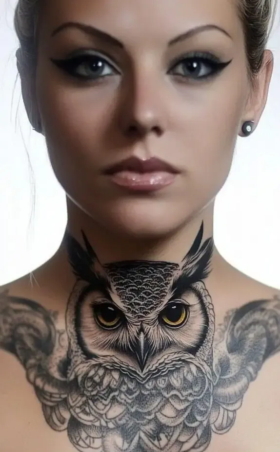 An owl tattoo, such as the one featured here, exudes mystery, intelligence, and wisdom. The bold design of the owl perched across the neck draws attention to the wearer s confidence and sense of curiosity. With its piercing eyes and intricate feather detailing, this tattoo is perfect for women who seek a dramatic and empowering symbol.