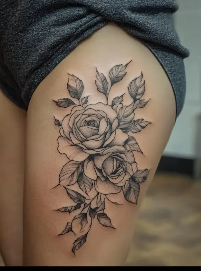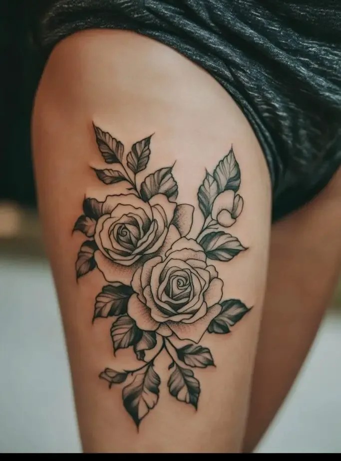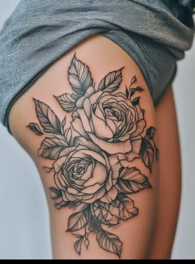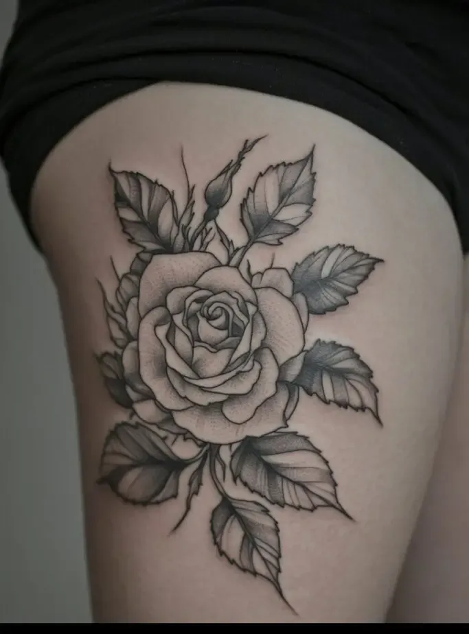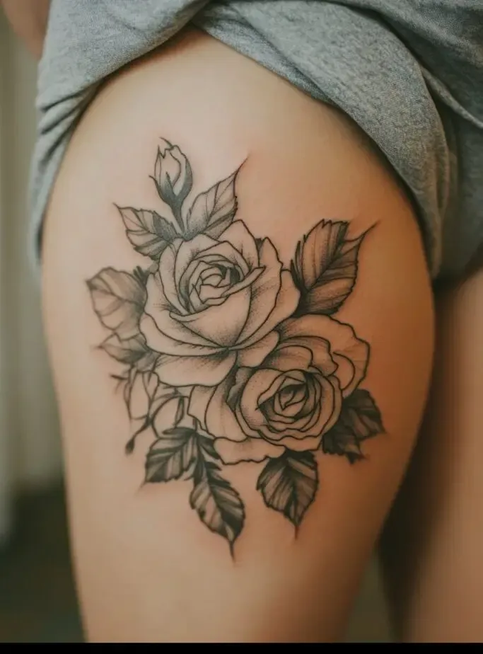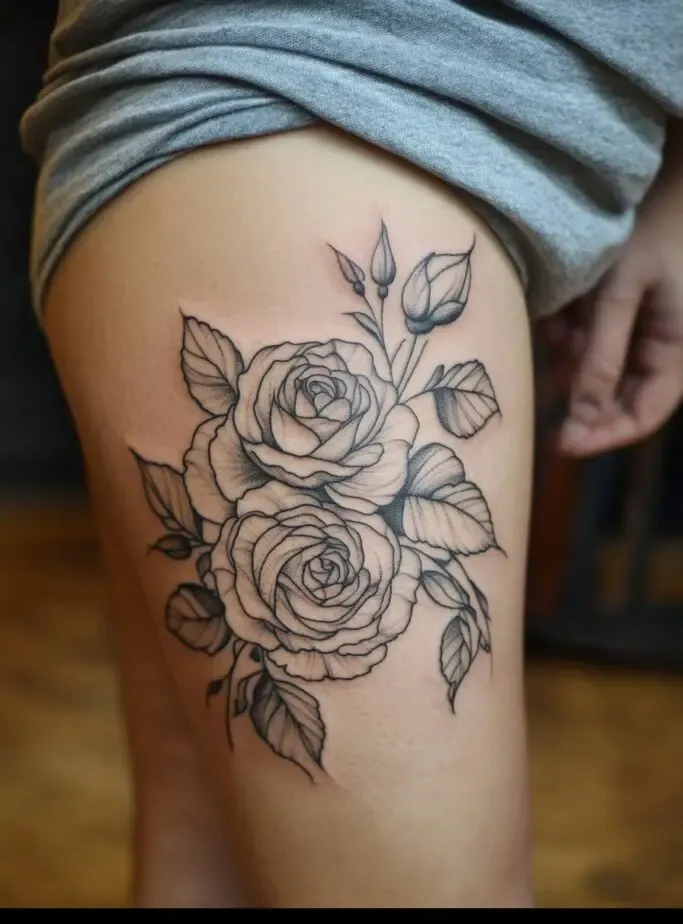 Rose tattoos are special because they are beautiful and have different meanings, like love and beauty. When you put a rose tattoo on your thigh, it feels even more special because the thigh is a strong and attractive part of the body.