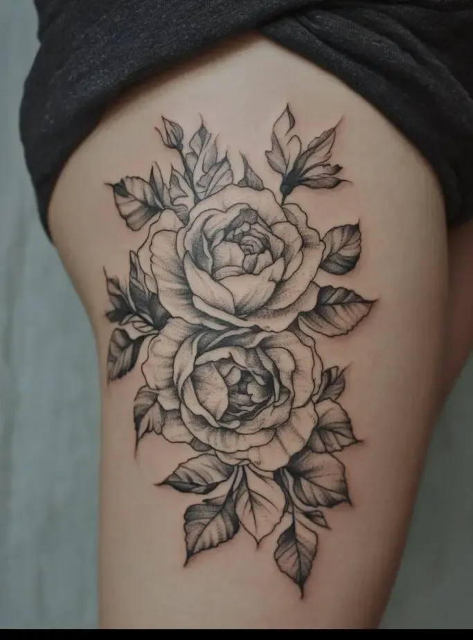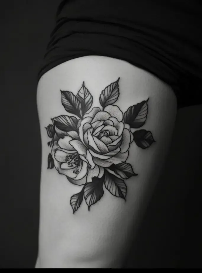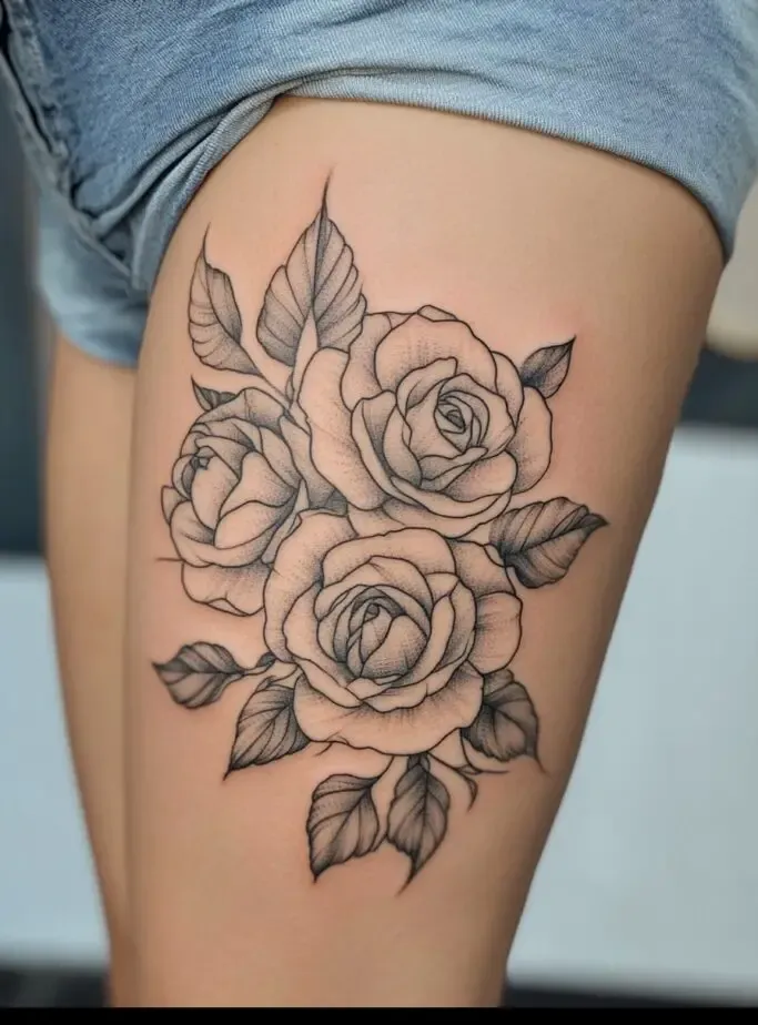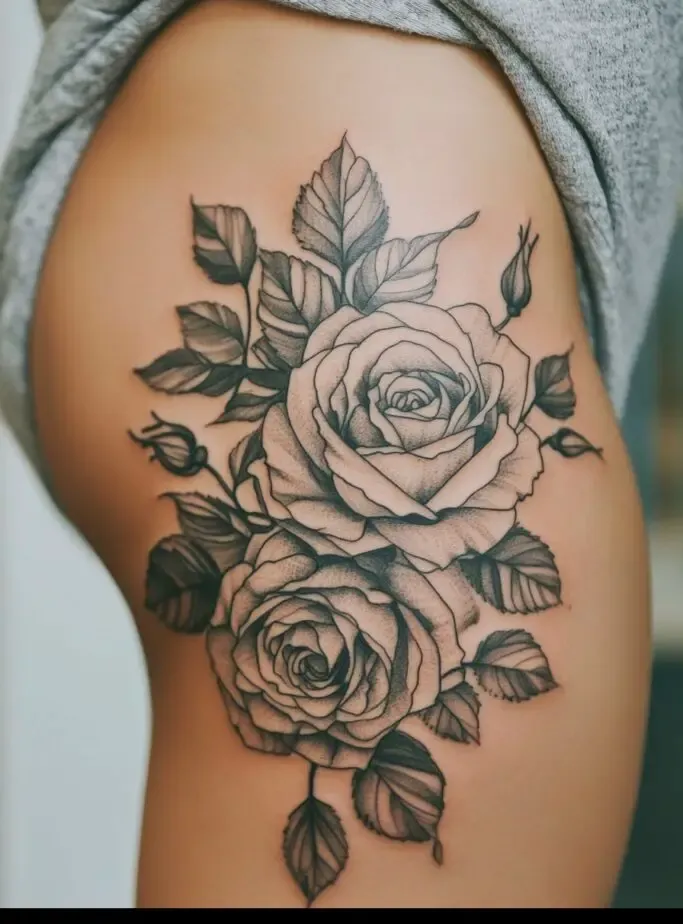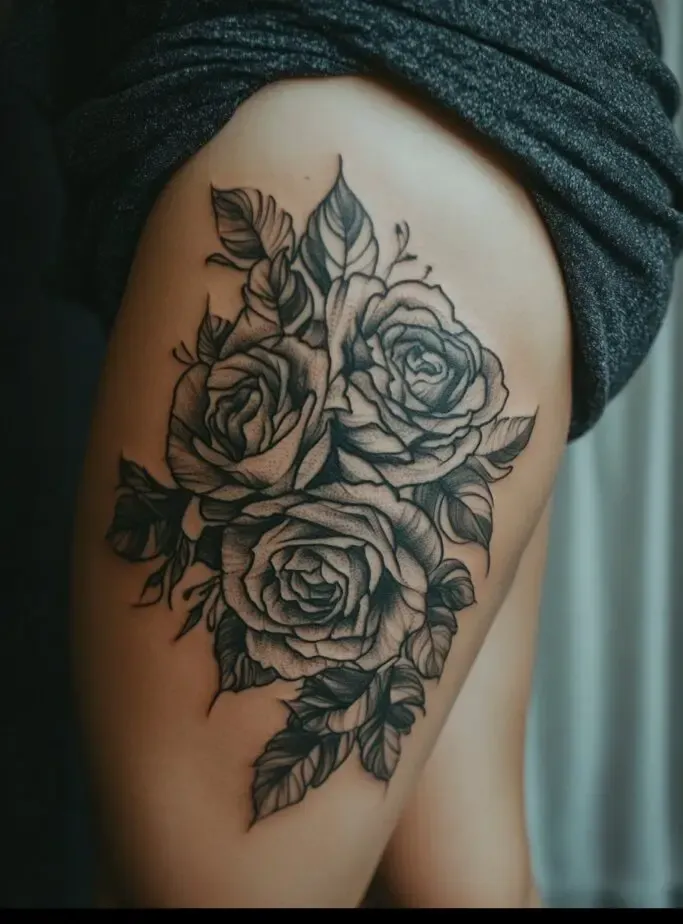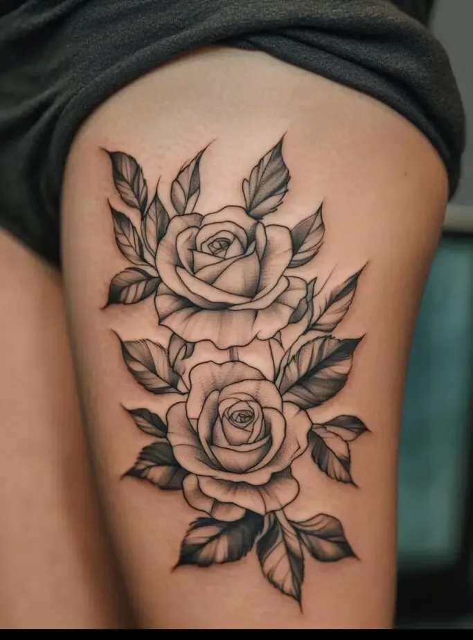 Rose tattoos are special because they are beautiful and have different meanings, like love and beauty. When you put a rose tattoo on your thigh, it feels even more special because the thigh is a strong and attractive part of the body.