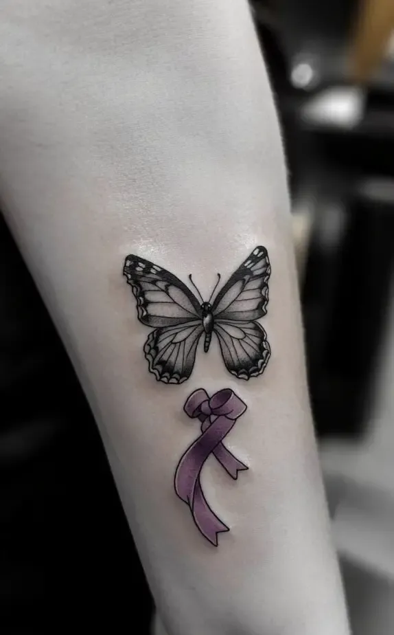 The butterfly and ribbon tattoo from the eighth image combines beauty and awareness. Butterflies symbolize transformation and rebirth, while the ribbon often represents support for a cause, such as cancer awareness. This design is perfect for anyone celebrating personal growth or honoring someone they love.