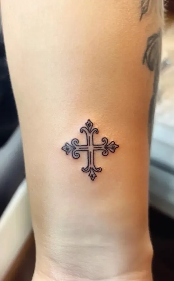 The delicate cross in the second image speaks to faith, spirituality, and devotion. Its intricate design makes it a beautiful piece of art, while its small size ensures it remains elegant and not overpowering. This tattoo is ideal for women who wish to carry their beliefs close to them, symbolizing strength and guidance.