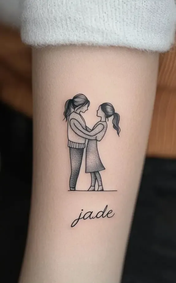 Finally, the mother-and-daughter tattoo in the last image is a heartwarming tribute to familial love. This design is perfect for those who want to immortalize their bond with a parent or child, capturing a moment of connection and love. The addition of the name adds a personal touch, making it a truly meaningful piece.