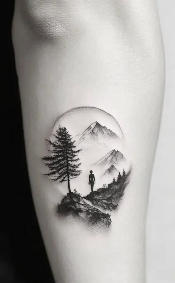 The fourth image features a breathtaking mountain landscape with a lone figure. This tattoo signifies adventure, resilience, and a deep connection to nature. Mountains often symbolize the strength to overcome challenges, while the lone figure can reflect introspection or a journey of self-discovery. It s an excellent choice for outdoor enthusiasts or those embarking on a transformative phase in life.