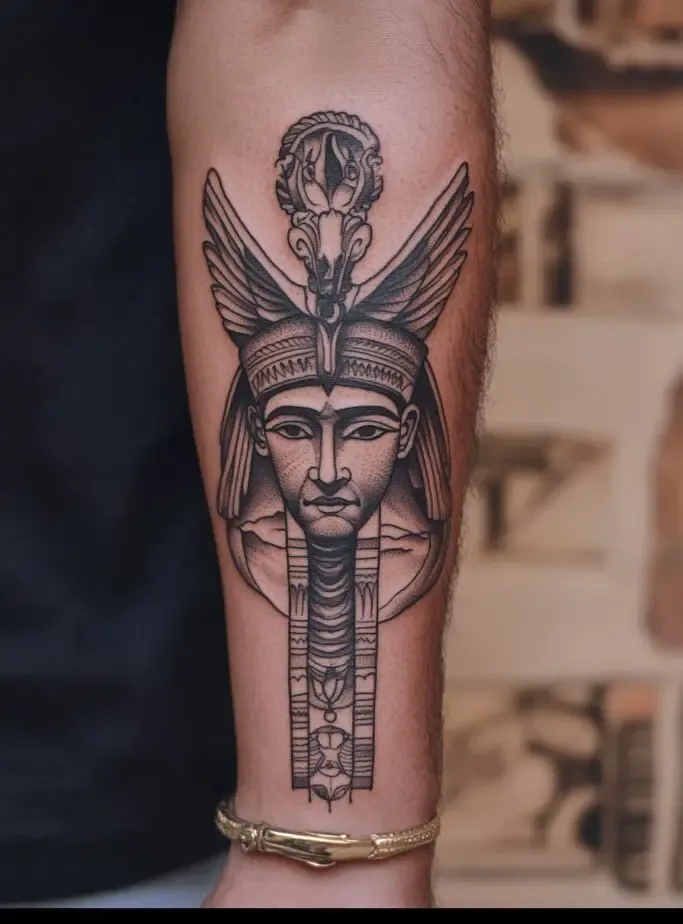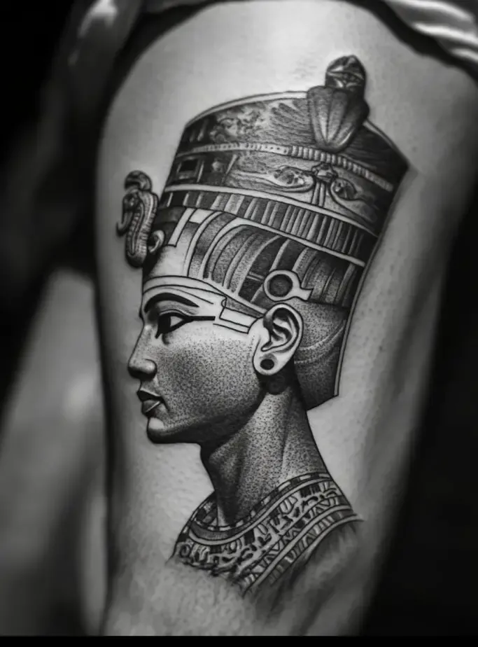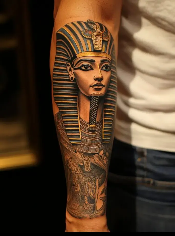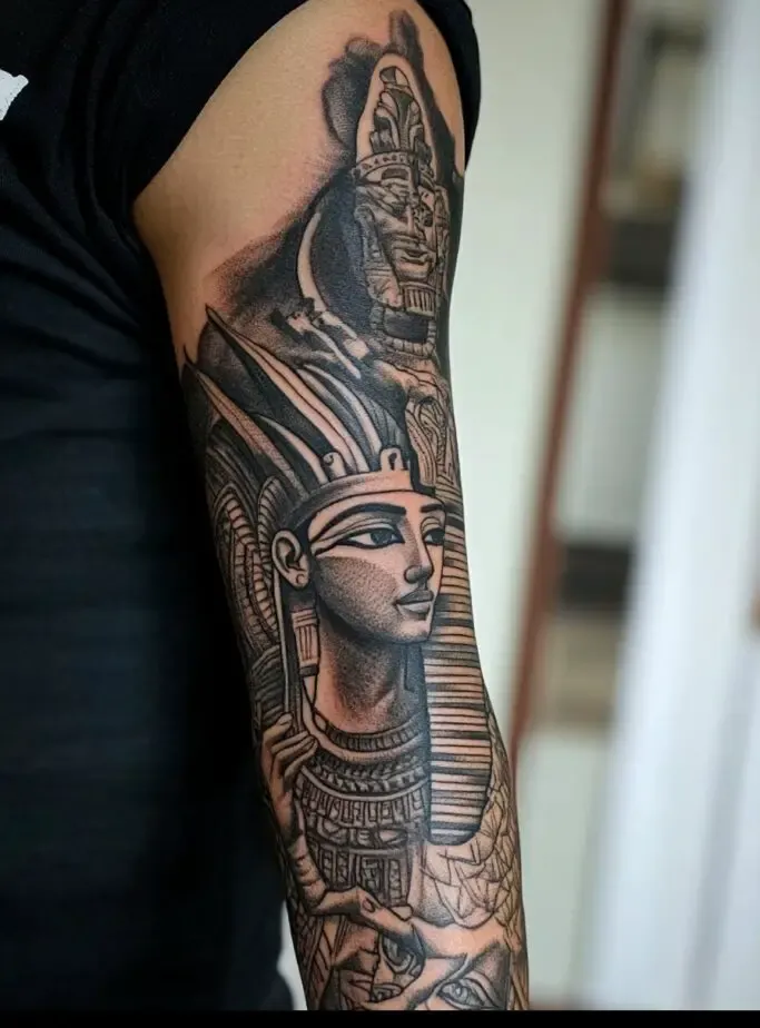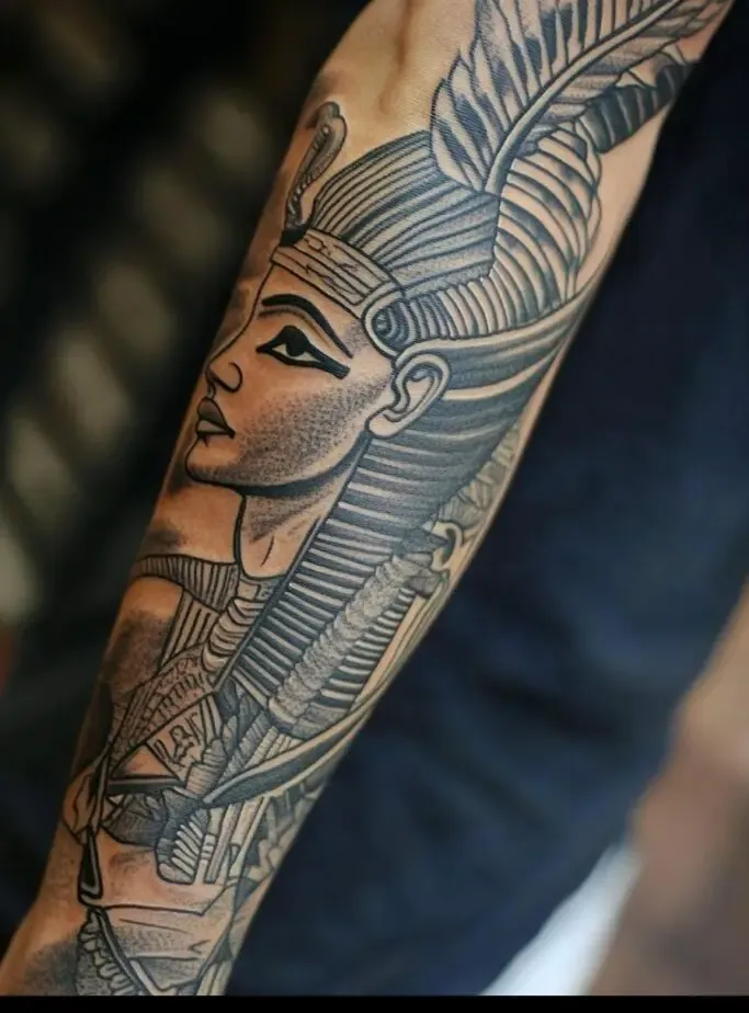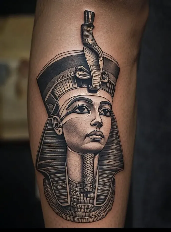Pharaohs and queens, such as Tutankhamun and Cleopatra, are symbols of power, leadership, and divine rule. Tattoos of these iconic figures often represent strength, authority, and a connection to the divine.