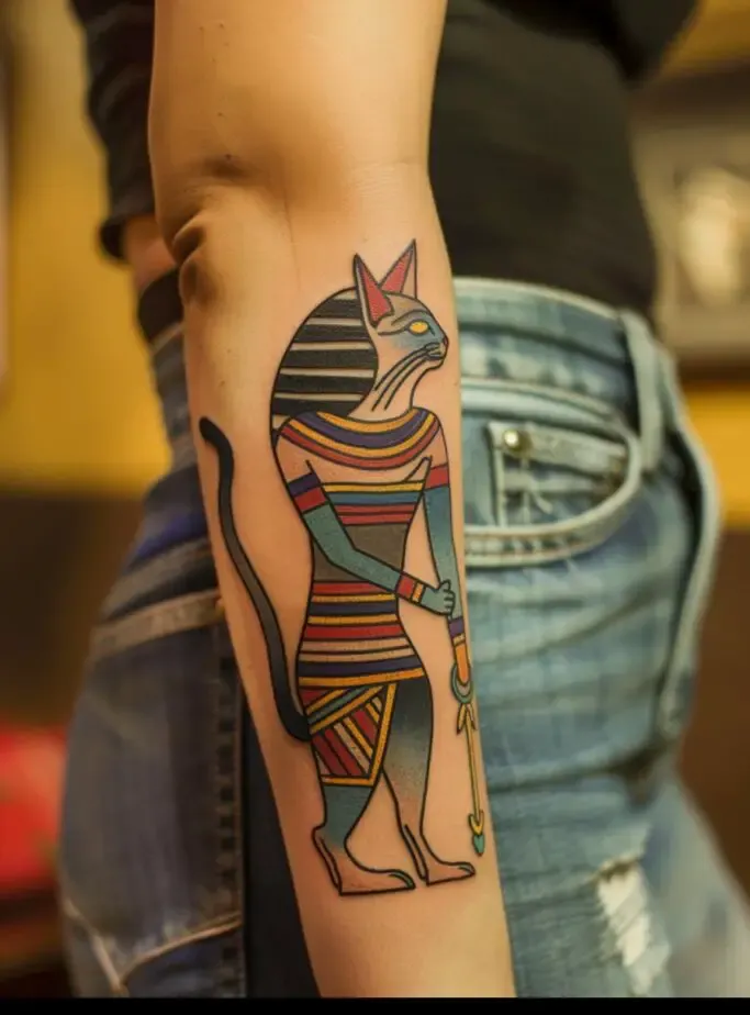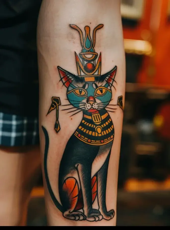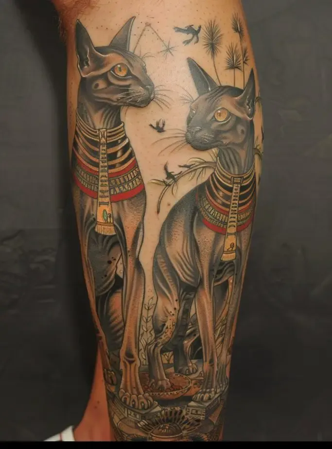 While many Egyptian tattoos are done in black and gray, you can also incorporate color to enhance certain elements or create a more vibrant design. For example, gold accents can add a regal touch, while blue can represent the Nile or the sky.