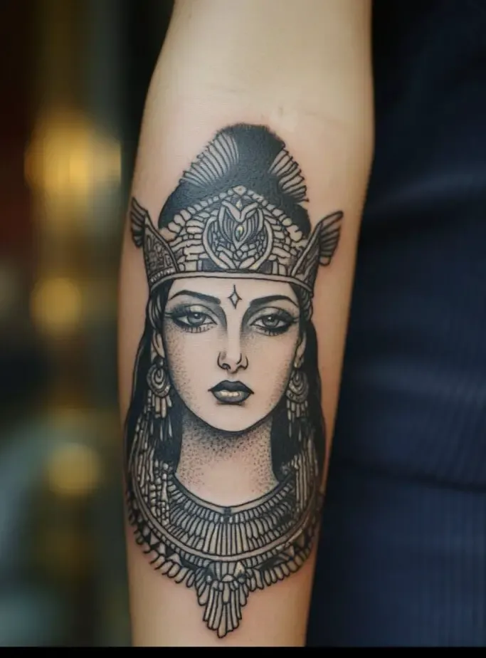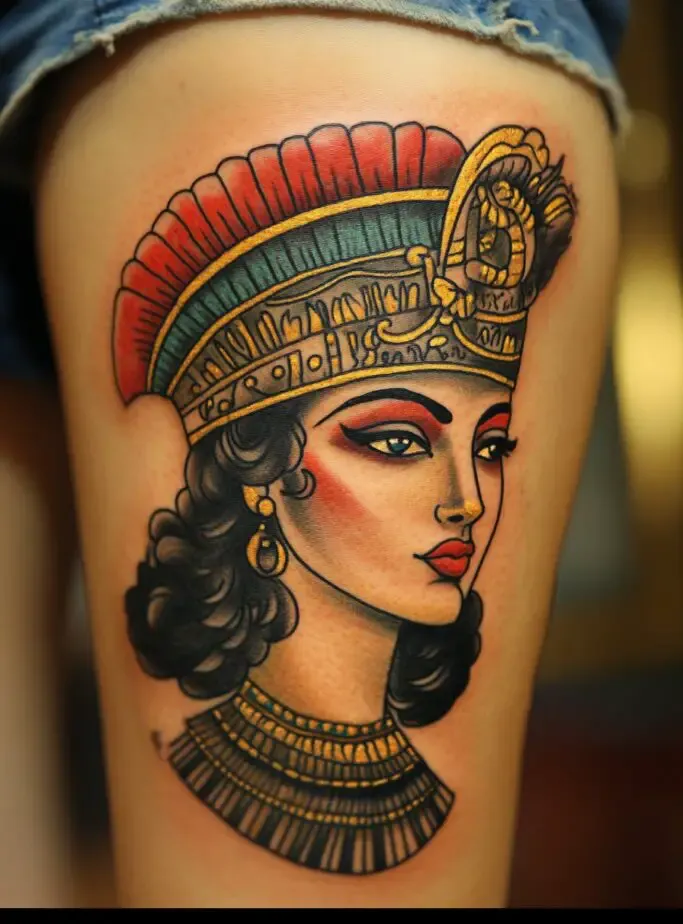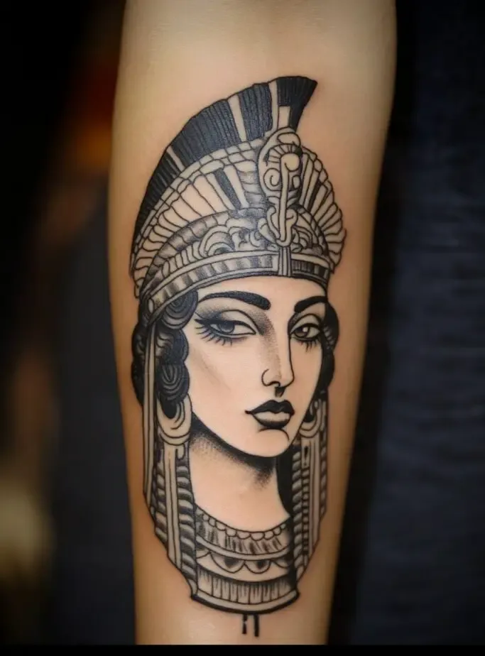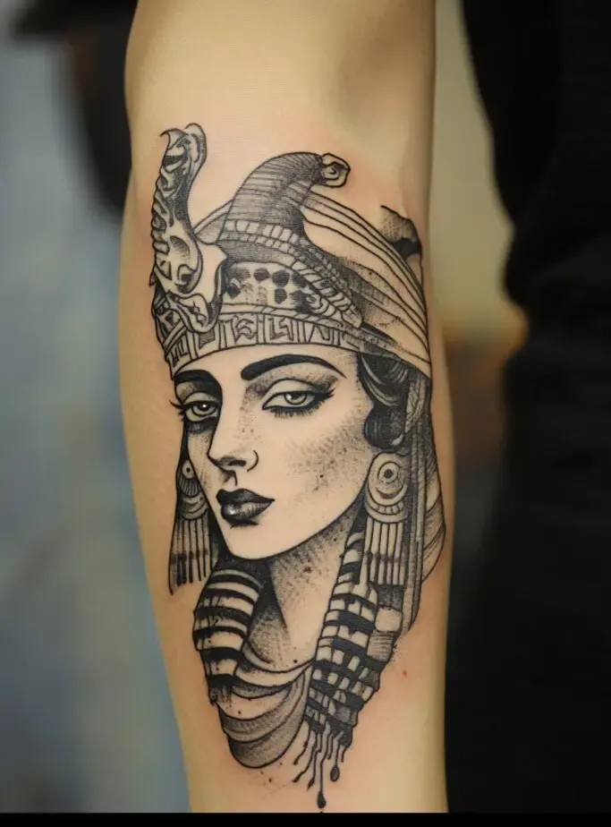 • Cleopatra: A tattoo of Cleopatra, often depicted with her iconic headdress and eyeliner, representing beauty, intelligence, and leadership.
