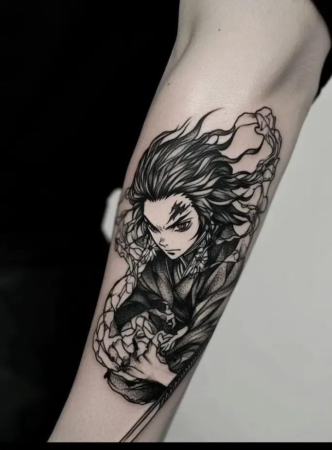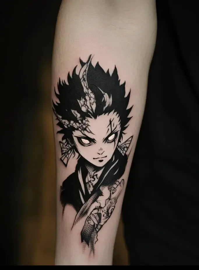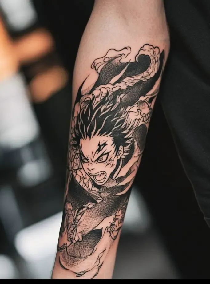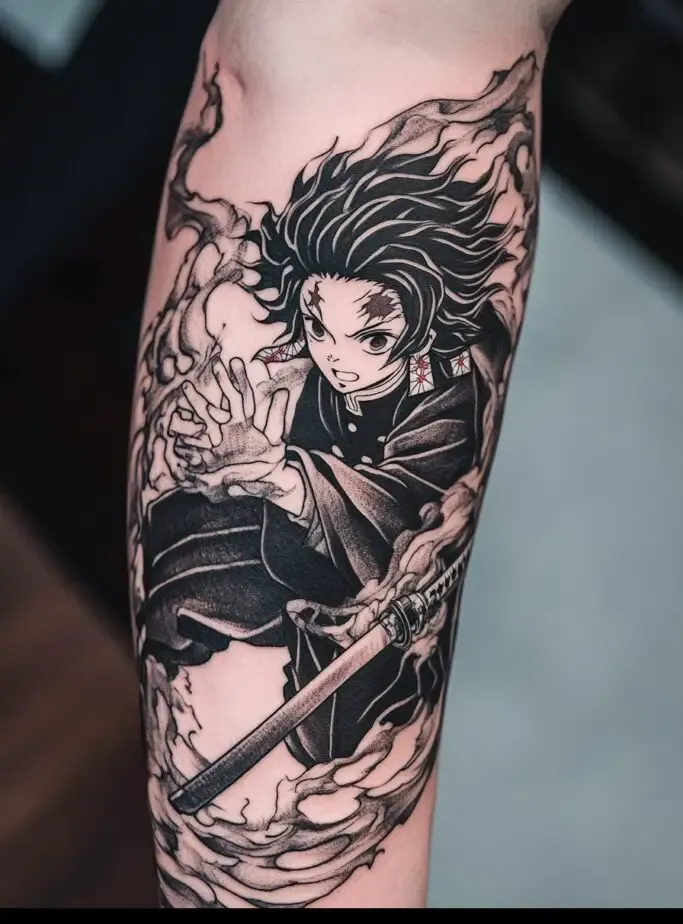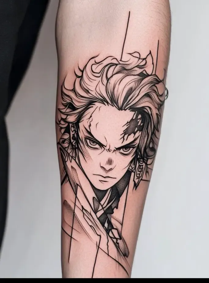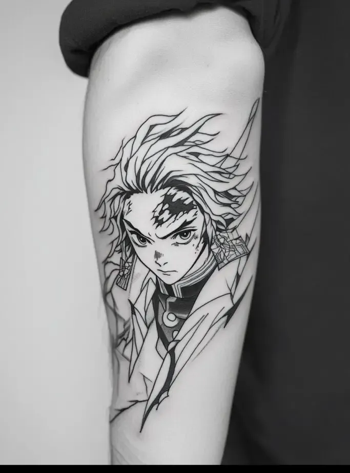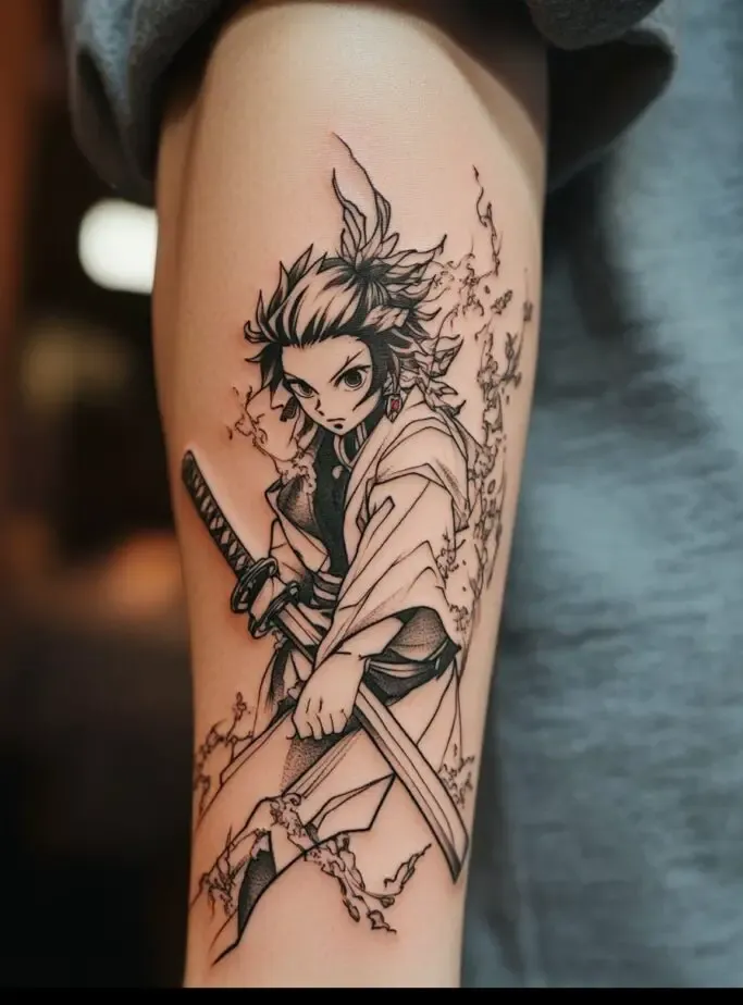 As the main protagonist, Tanjiro Kamado is a popular choice for Demon Slayer” tattoos. Tanjiro s character represents resilience, compassion, and unwavering determination. A tattoo of Tanjiro often features his distinctive hanafuda earrings, his black and green checkered haori, or his Nichirin sword. Some fans choose to depict Tanjiro in action, showcasing his Water Breathing techniques with beautiful, swirling water patterns. These tattoos symbolize the strength to overcome obstacles and protect loved ones.