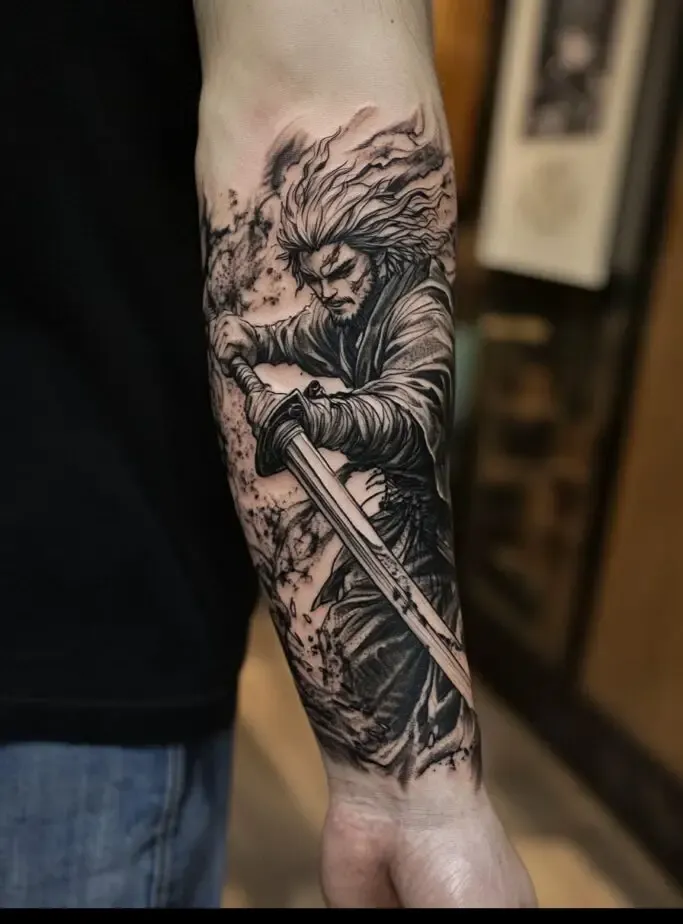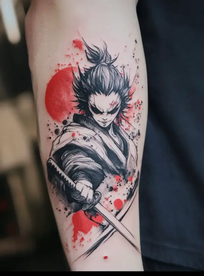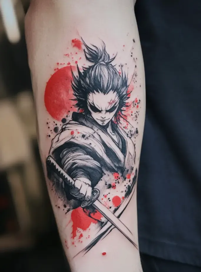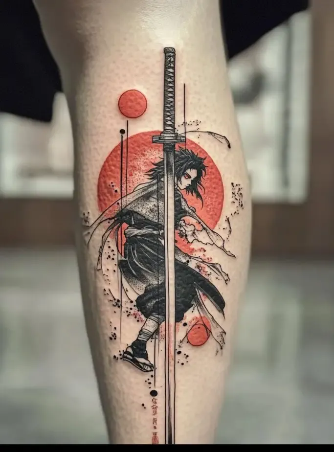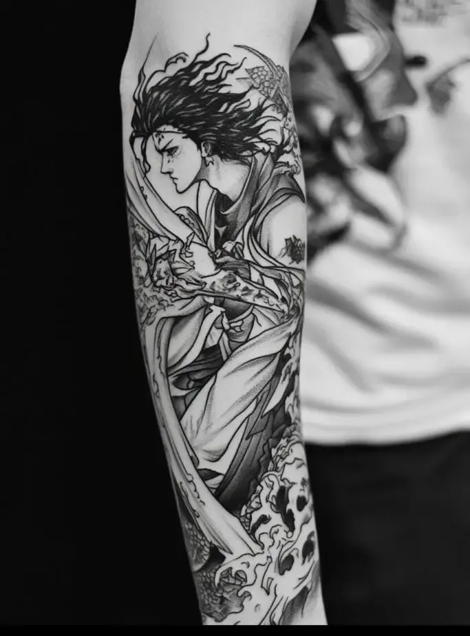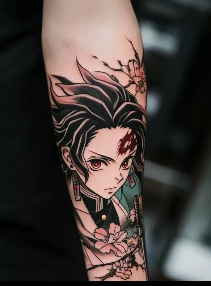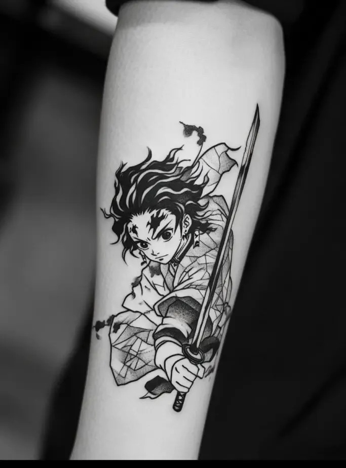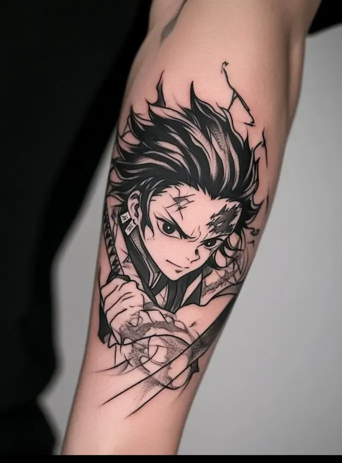 As the main protagonist, Tanjiro Kamado is a popular choice for Demon Slayer” tattoos. Tanjiro s character represents resilience, compassion, and unwavering determination. A tattoo of Tanjiro often features his distinctive hanafuda earrings, his black and green checkered haori, or his Nichirin sword. Some fans choose to depict Tanjiro in action, showcasing his Water Breathing techniques with beautiful, swirling water patterns. These tattoos symbolize the strength to overcome obstacles and protect loved ones.