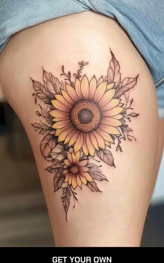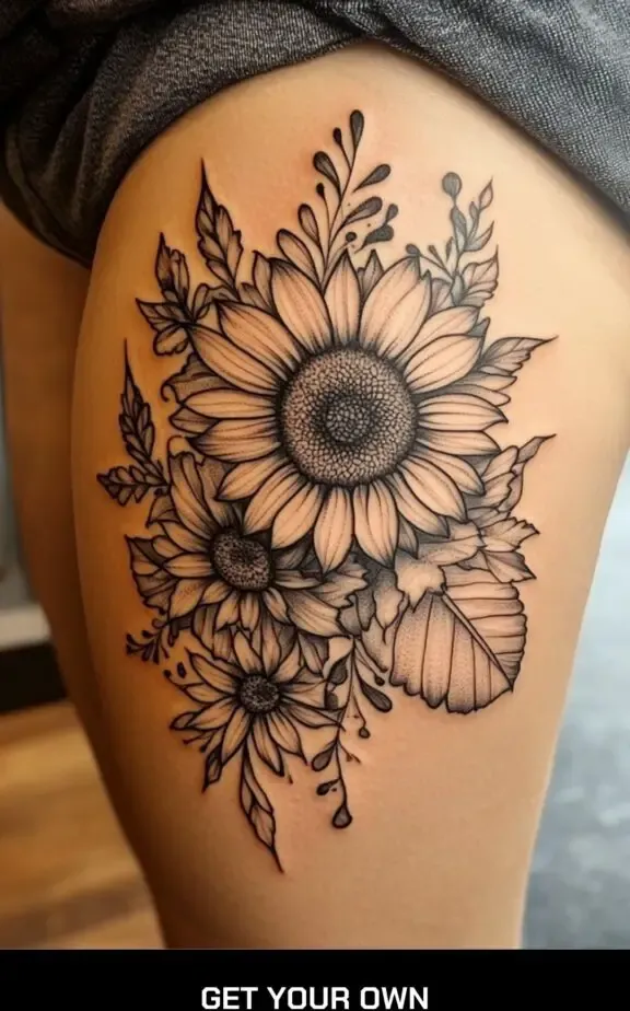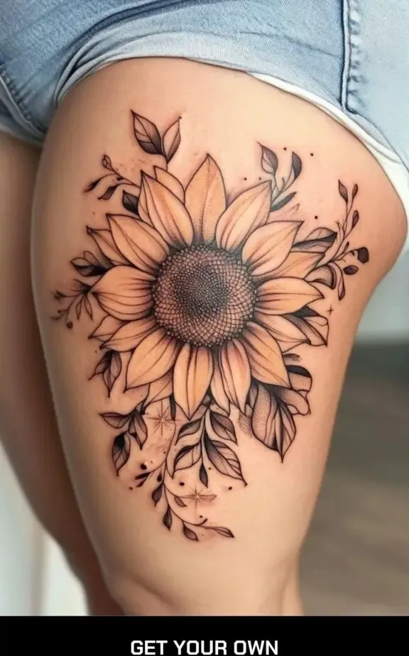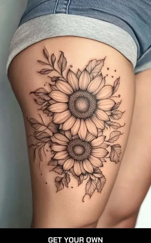 Sunflowers are symbols of happiness, positivity, and loyalty. Their bright, cheerful appearance makes them a popular choice for women who want a tattoo that radiates warmth and optimism. A sunflower thigh tattoo can be as simple as a single flower or as complex as a field of sunflowers swaying in the breeze. The tattoo can be done in traditional yellow and brown tones or in a more abstract style with different colors. This design is perfect for those who want to carry a piece of sunshine with them wherever they go.