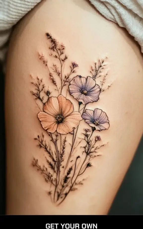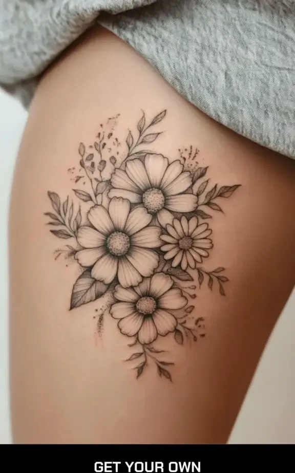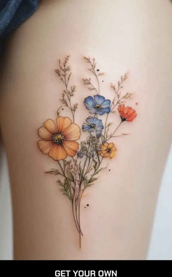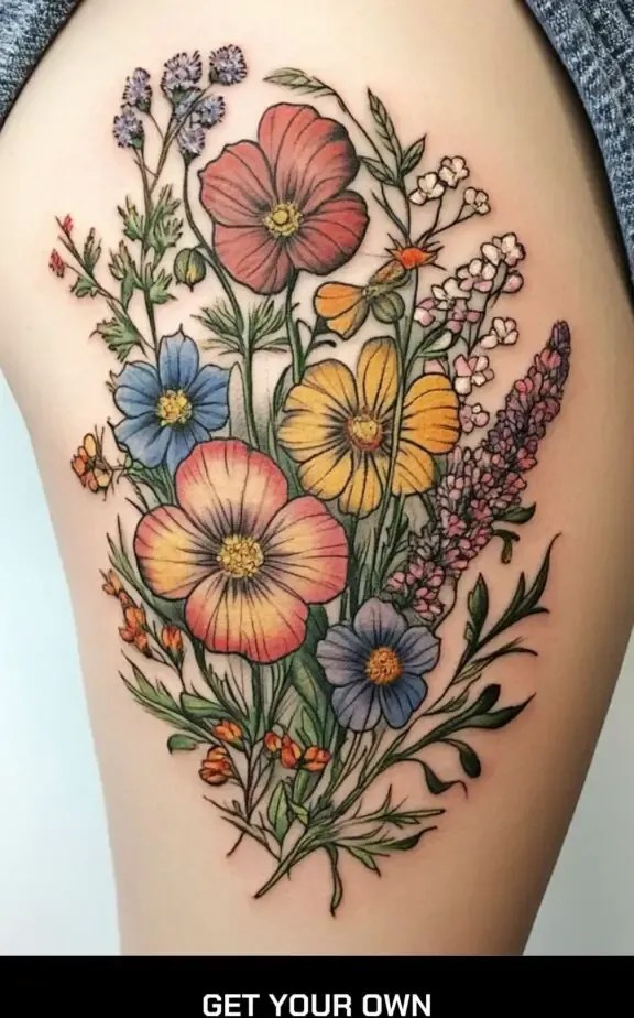 A wildflower tattoo can represent freedom, resilience, and the beauty of nature in its untamed form. A wildflower thigh tattoo might feature a variety of flowers, such as daisies, poppies, and lavender, creating a bouquet of colors and shapes that flow naturally along the thigh. This tattoo can be as simple or as detailed as you like, with the option of adding elements like butterflies, bees, or birds to enhance the natural theme.