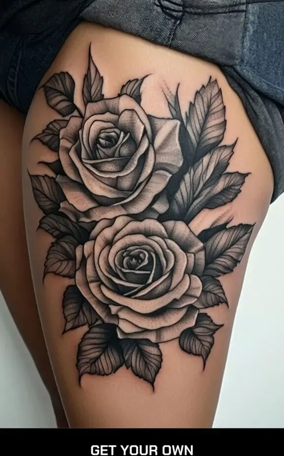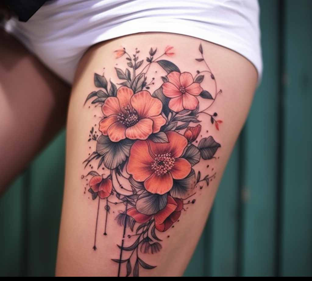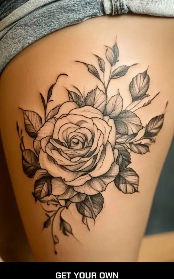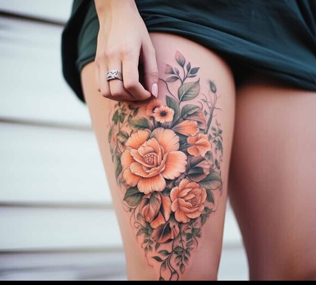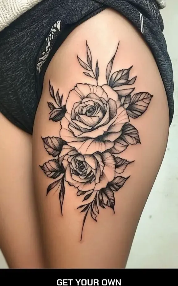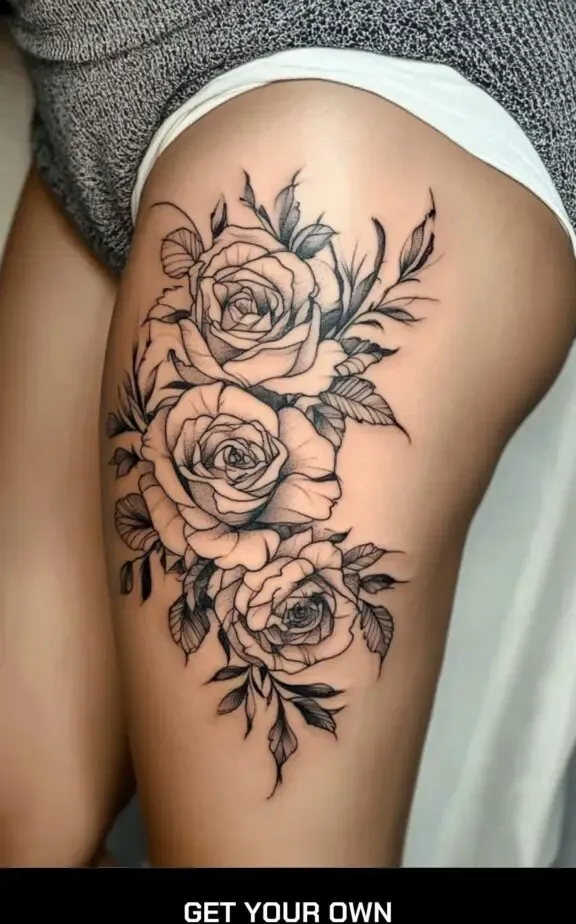Roses are one of the most iconic and popular choices for floral tattoos. They symbolize love, beauty, and passion, making them a timeless option for women. A rose thigh tattoo can be designed in many styles, from a single, realistic rose to a bouquet of roses winding up the thigh. The versatility of the rose allows for various color choices red for love, yellow for friendship, white for purity, and black for mystery. Whether in full bloom or as a budding rose, this tattoo can capture the essence of femininity and strength.
