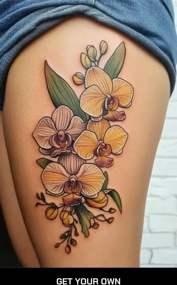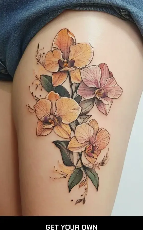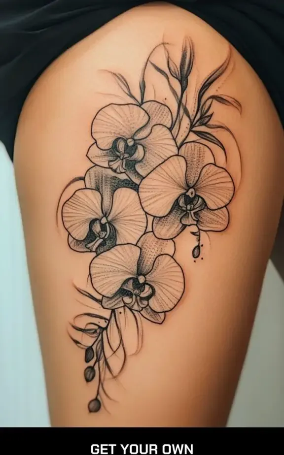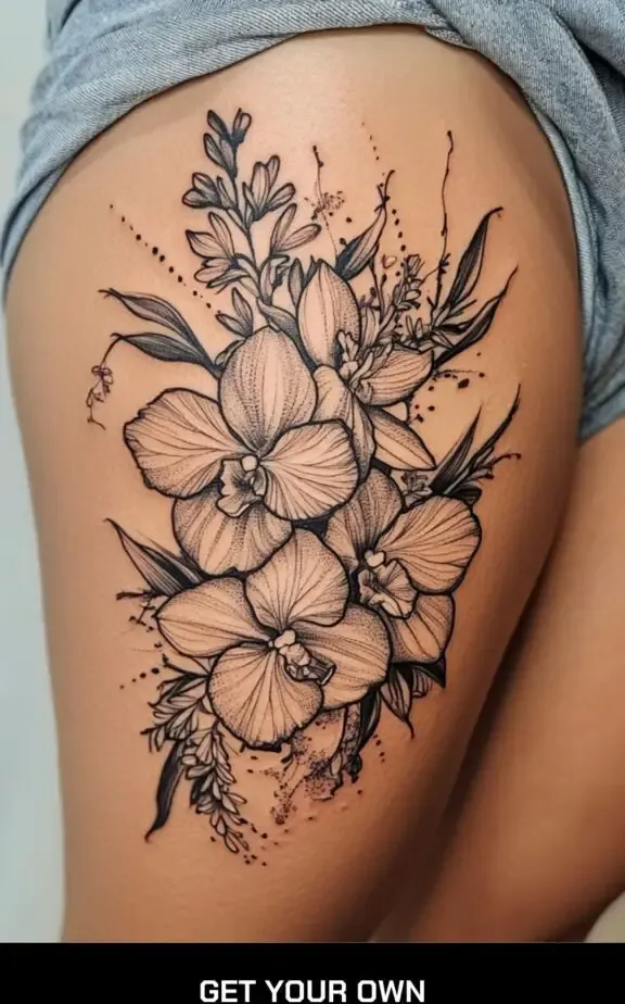 Orchids are symbols of luxury, beauty, and strength. An orchid thigh tattoo can be incredibly detailed, showcasing the flower s intricate petals and unique shape. These tattoos are often done in purple, white, or pink, but they can also be customized with other colors to match your personal style. Orchids can be depicted alone or paired with other flowers or elements like butterflies or vines for a more complex design.