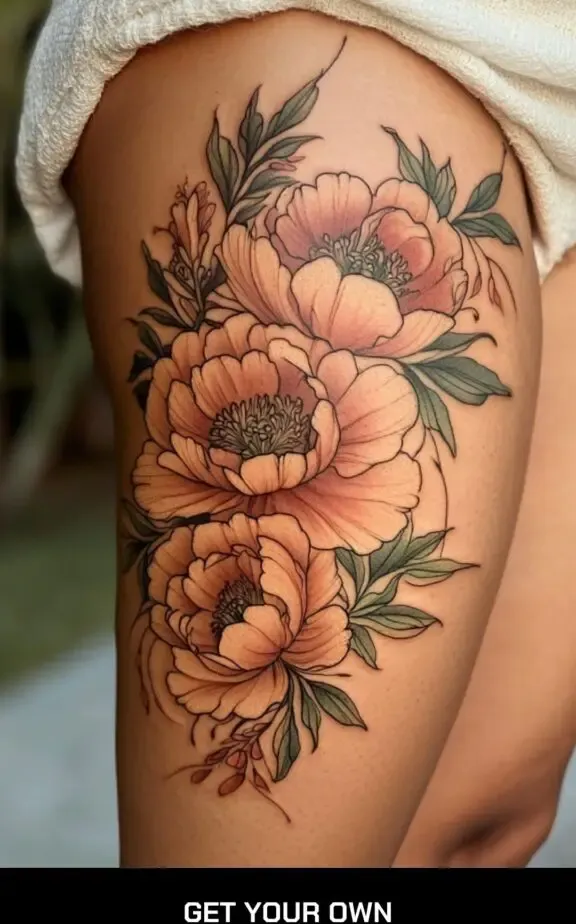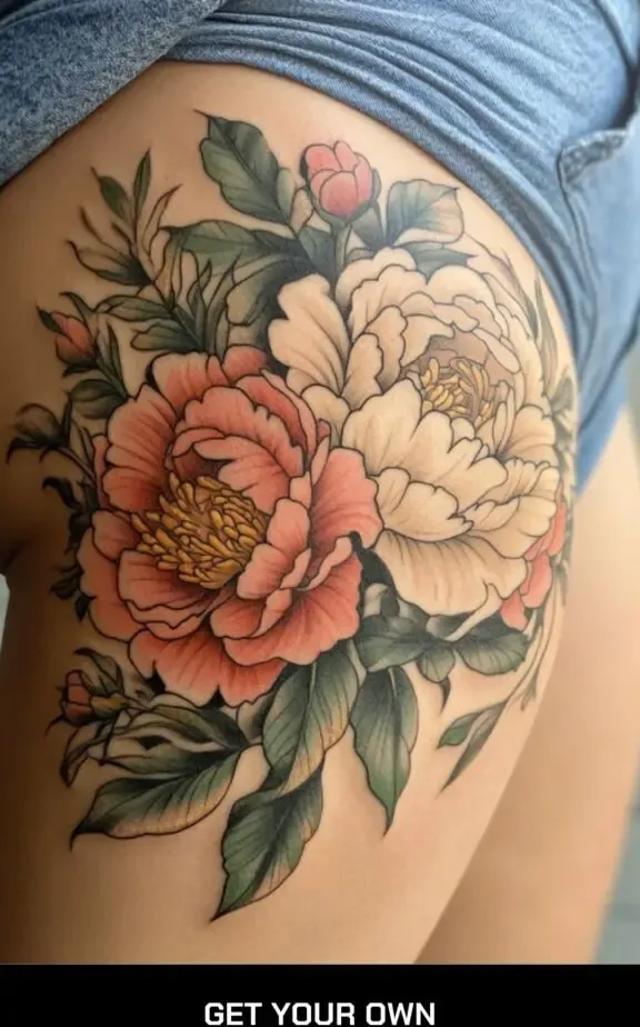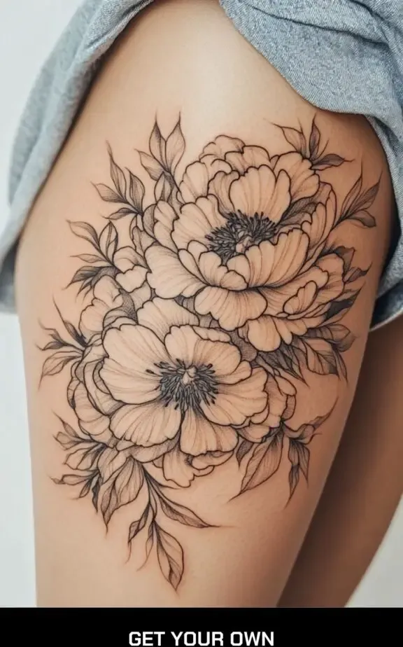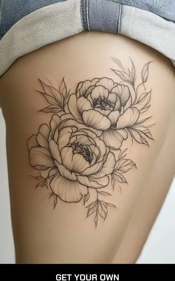 Peonies are known for their lush, full blooms and are often associated with prosperity, romance, and honor. A peony thigh tattoo can be large and intricate, covering the entire thigh, or smaller and more delicate, depending on your preference. These tattoos often feature multiple shades of pink, red, or white, creating a vibrant and eye-catching design. Peonies can also be combined with other flowers or elements, such as leaves or ribbons, to create a personalized piece of art.