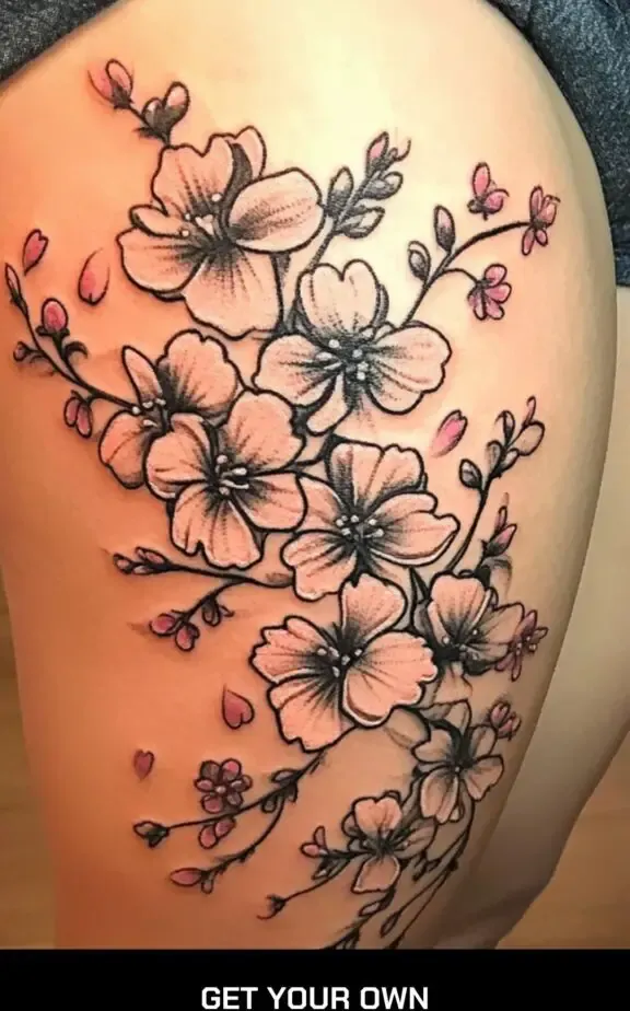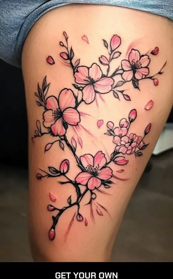 Cherry blossoms, or sakura, are cherished in Japanese culture as symbols of beauty, renewal, and the fleeting nature of life. A cherry blossom thigh tattoo is both elegant and delicate, often depicted as a branch of blossoms gracefully curving around the thigh. These tattoos are typically done in soft pinks and whites, with the option of adding a touch of red or gold for added depth. Cherry blossoms can be paired with other elements like birds or traditional Japanese motifs to create a culturally rich design.