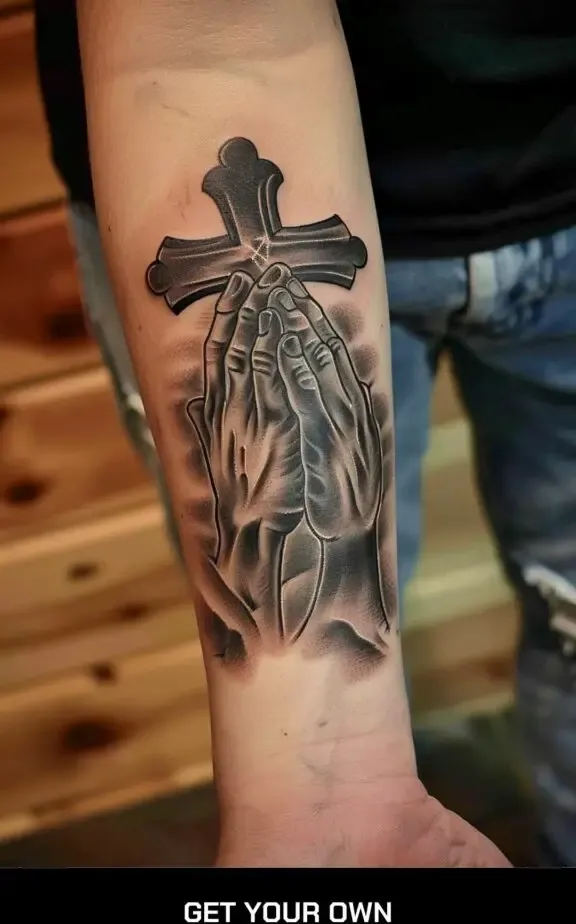 Adding a cross to the praying hands tattoo can represent deep Christian faith. This design can be simple or intricate, depending on your preference.
